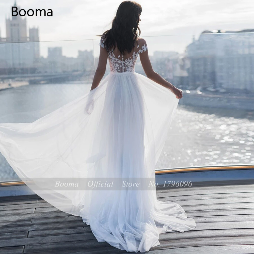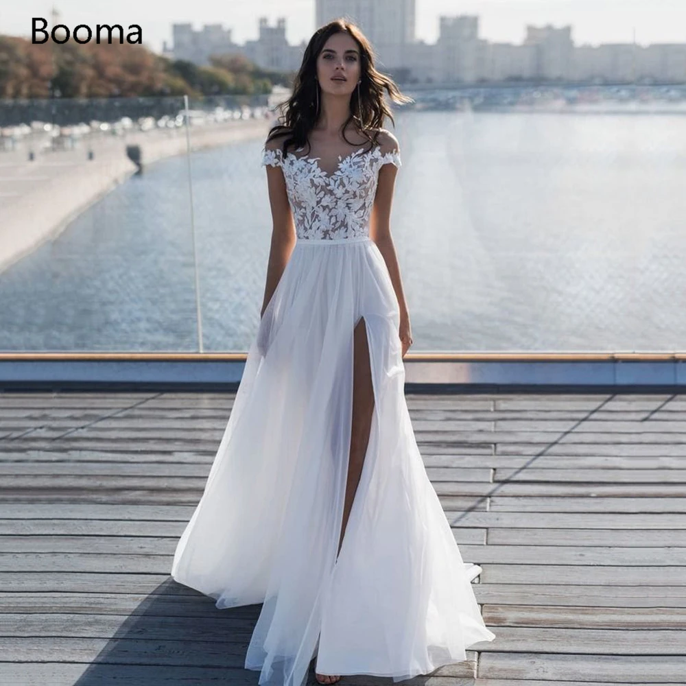 Белое пляжное свадебное платье с открытыми плечами, с высоким разрезом, а-силуэт, свадебные платья, иллюзионная Кружевная аппликация, с рукавами-крылышками, женское