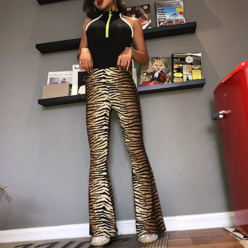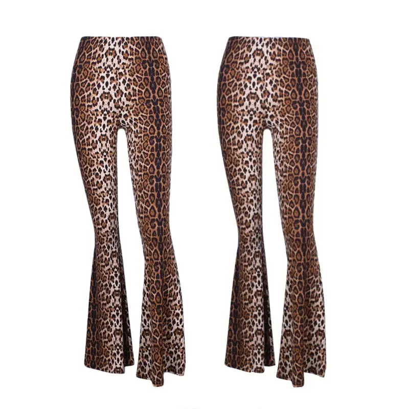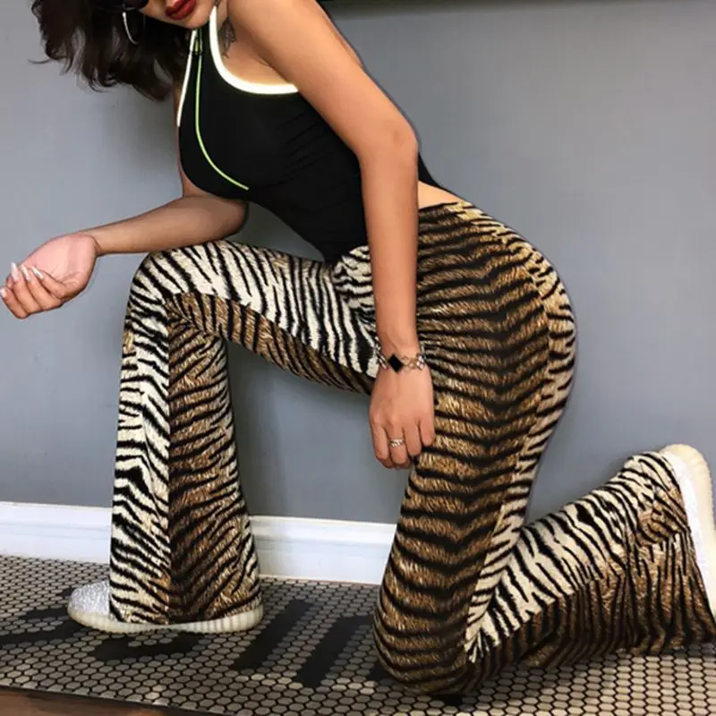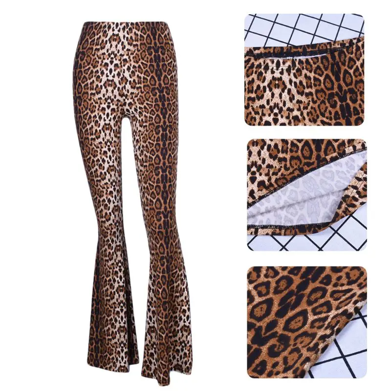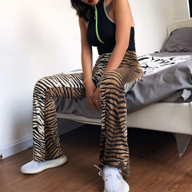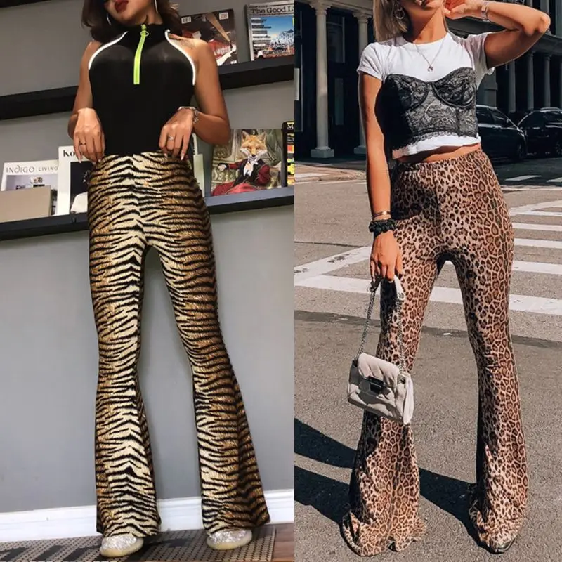 Женские широкие брюки с высокой талией, длинные штаны в винтажном стиле с леопардовым принтом тигра, клеш колокол, обтягивающие брюки