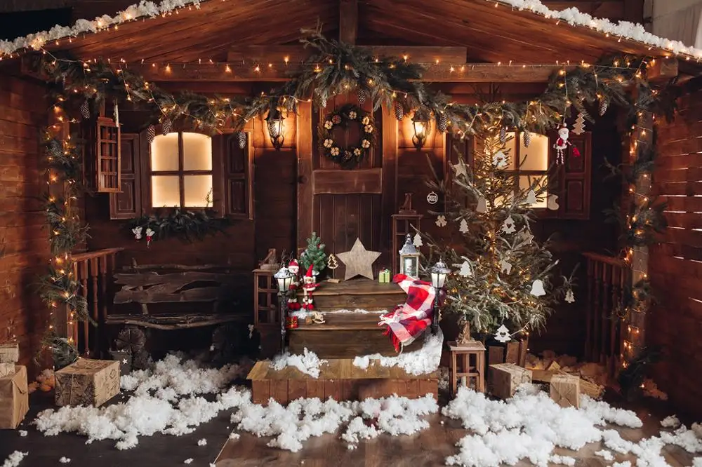 Фон для рождественской фотосъемки зимняя снежная деревянная кабина ...