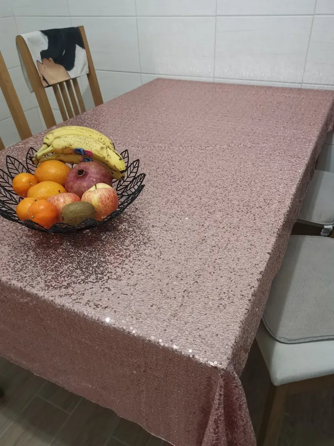 Очень красивая скатерть, спасибо продавцу. На овальный стол взяла прямоугольную скатерть. Хорошо лежит на столе, не сползает. Пайетки переливаются, блестят под вечерним освещением. На новый год будет идеальное украшение стола.
