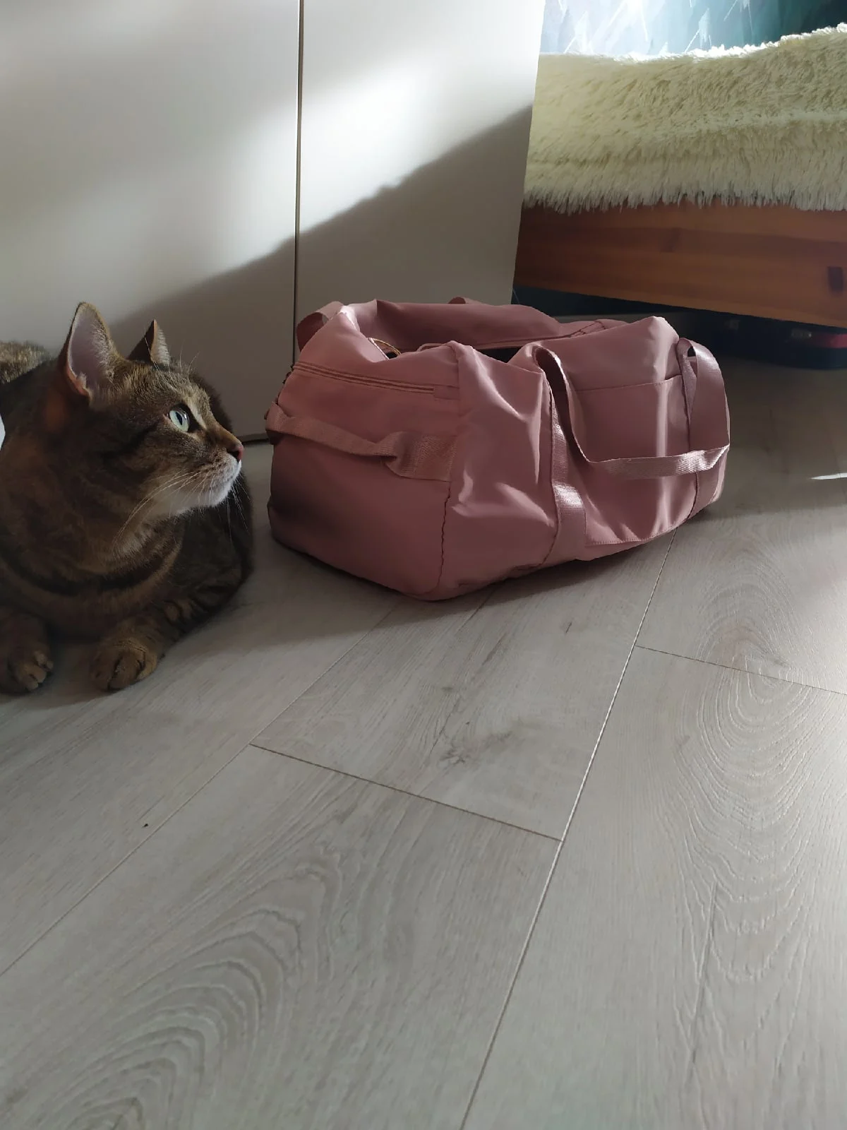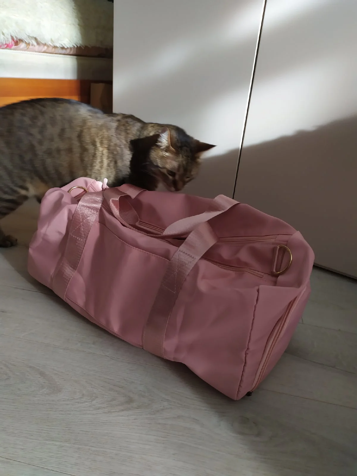 Это широко и красиво. Он имеет водонепроницаемый карман и отделку для обуви, в дополнение к двум маленьким карманам, одному из них с застежкой-молнией. Мне понравилось.