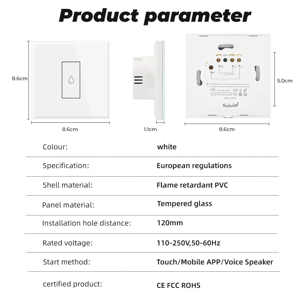 Цвет: белыйСпецификация: европейские правилаМатериал корпуса: огнестойкий ПВХМатериал панели: закаленное стеклоРасстояние между монтажными отверстиями: 60 ммНоминальное напряжение: 110-250 В, 50-60 ГцМетод запуска: Touch/мобильное приложение/Голосовой динамикСертифицированный продукт: CE FCC ROHSМаксимальный ток: 20А