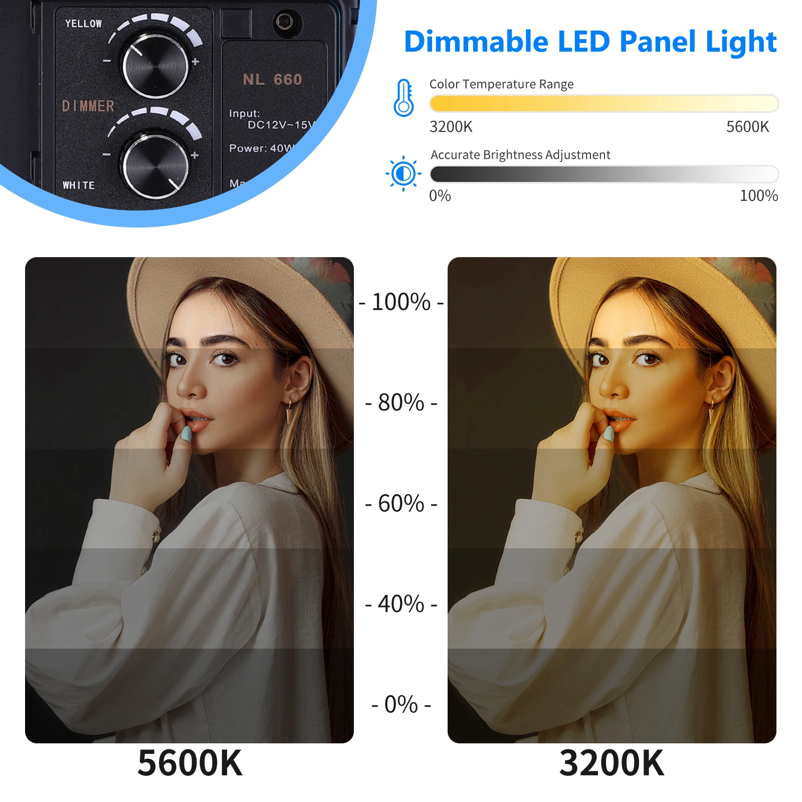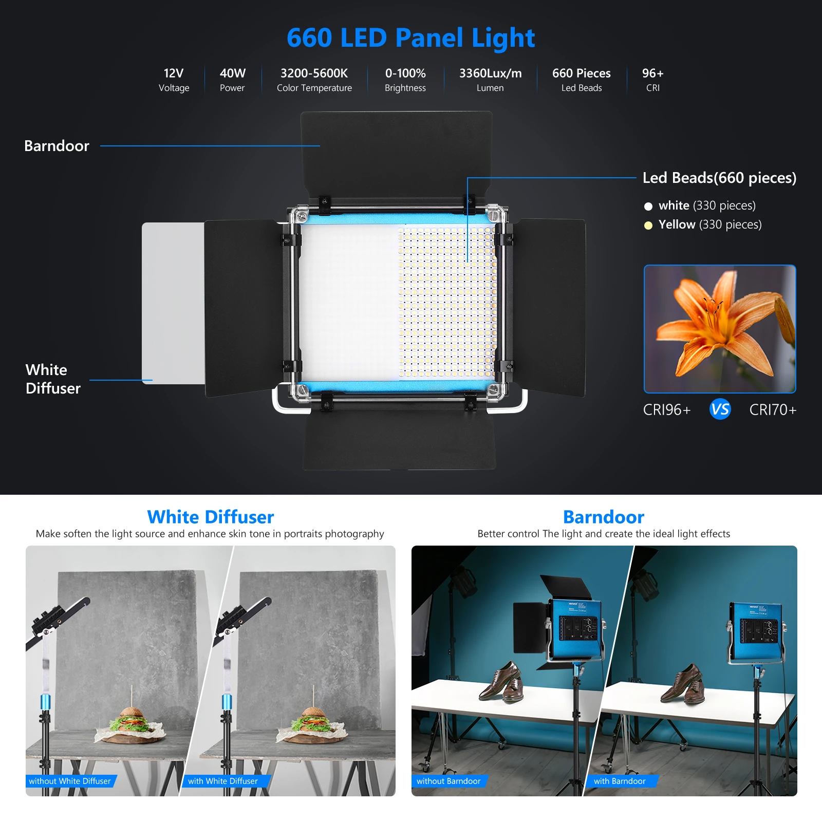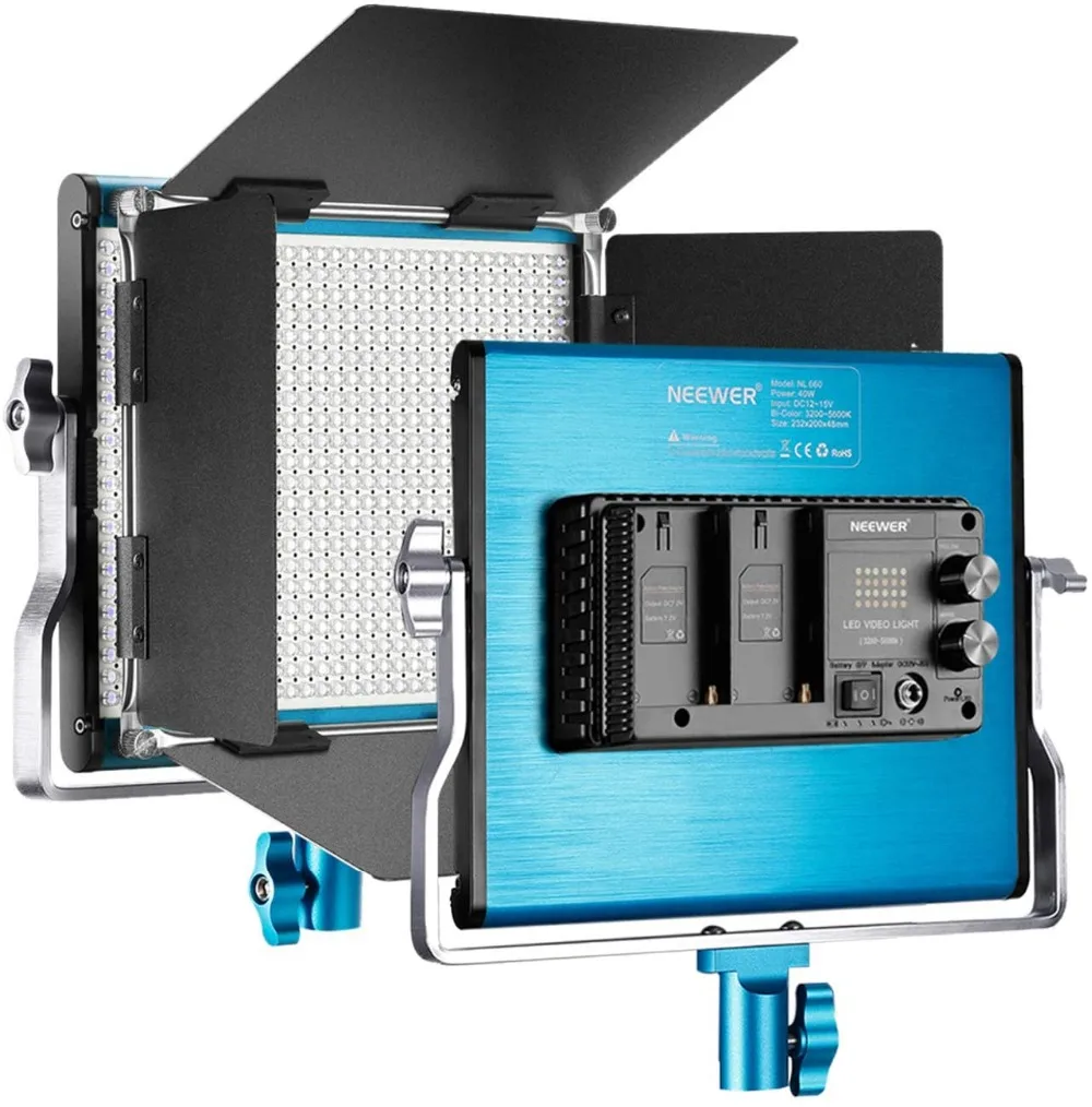 Светодиодная подсветка 660: изготовлена из высококачественного алюминиевого сплава, простого синего и элегантного внешнего вида; светильник па, оснащенная 330 белыми и 330 желтыми светодиодными долговечными лампами, может освещать переменный баланс белого от дневсветильник света вольфрама при цветовой температуре от 3200 до 5600K