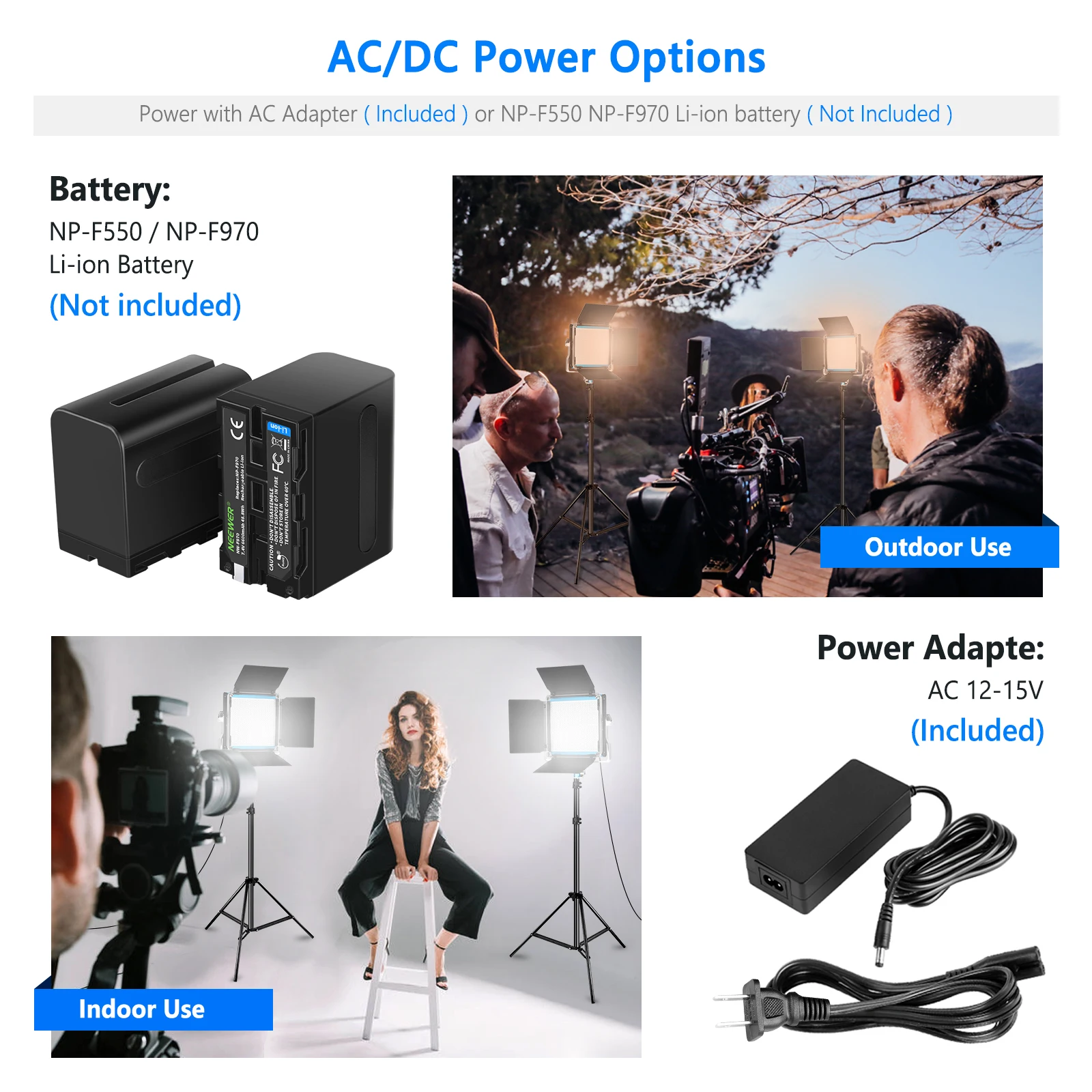 ВАРИАНТЫ ПИТАНИЯ переменного/постоянного тока: питание с адаптером переменного тока (в комплекте) или литий-ионным аккумулятором NP-F550 NP-F970 (не входит в комплект); Можно разместить прямо на подставке светильник на земле или на столе, обеспечивает множество решений для съемки, более удобных для ваших творческих работ