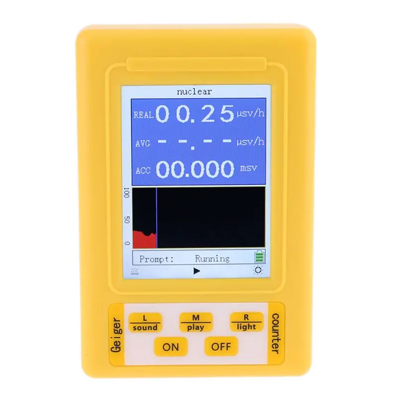 С отключением звука, будильником, кнопкой выбора звука частиц, тестированием, кнопкой выбора перепроверки среднего значения, подсветкой можно включать или выключать.