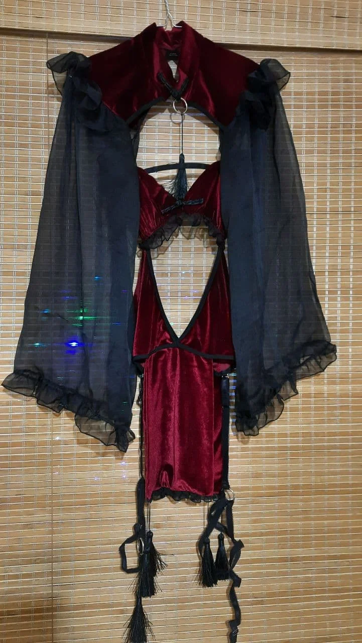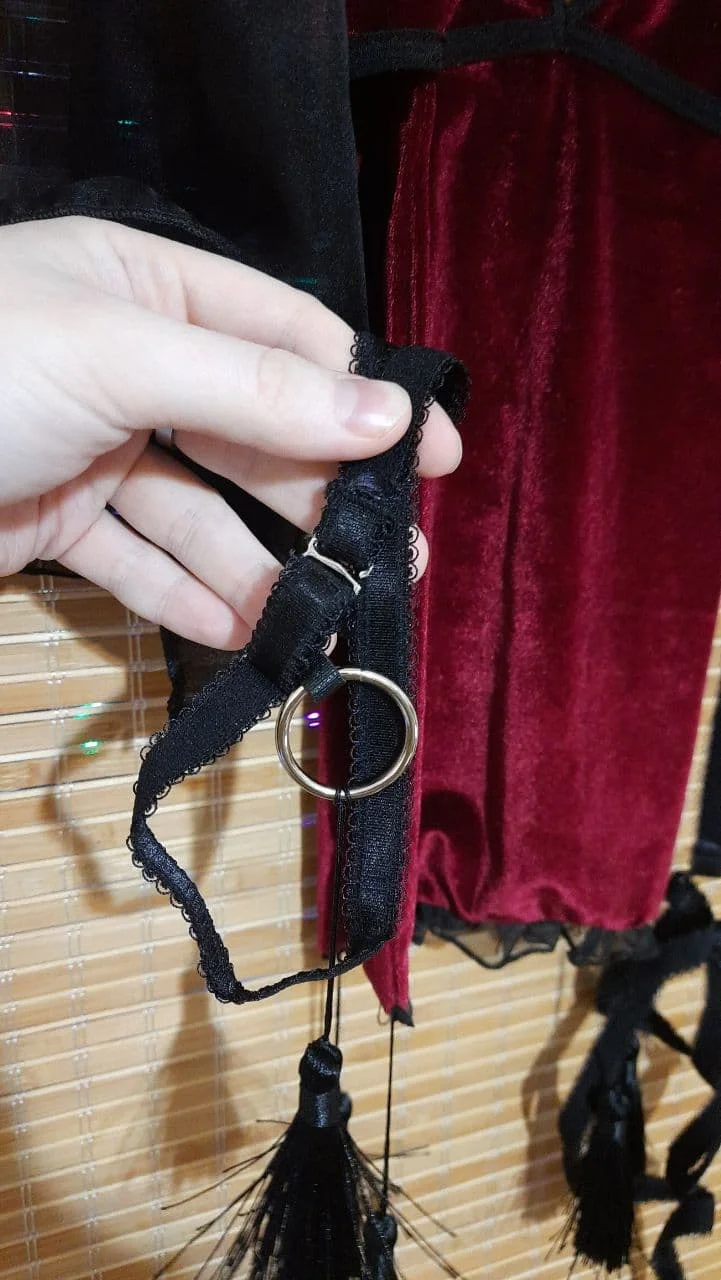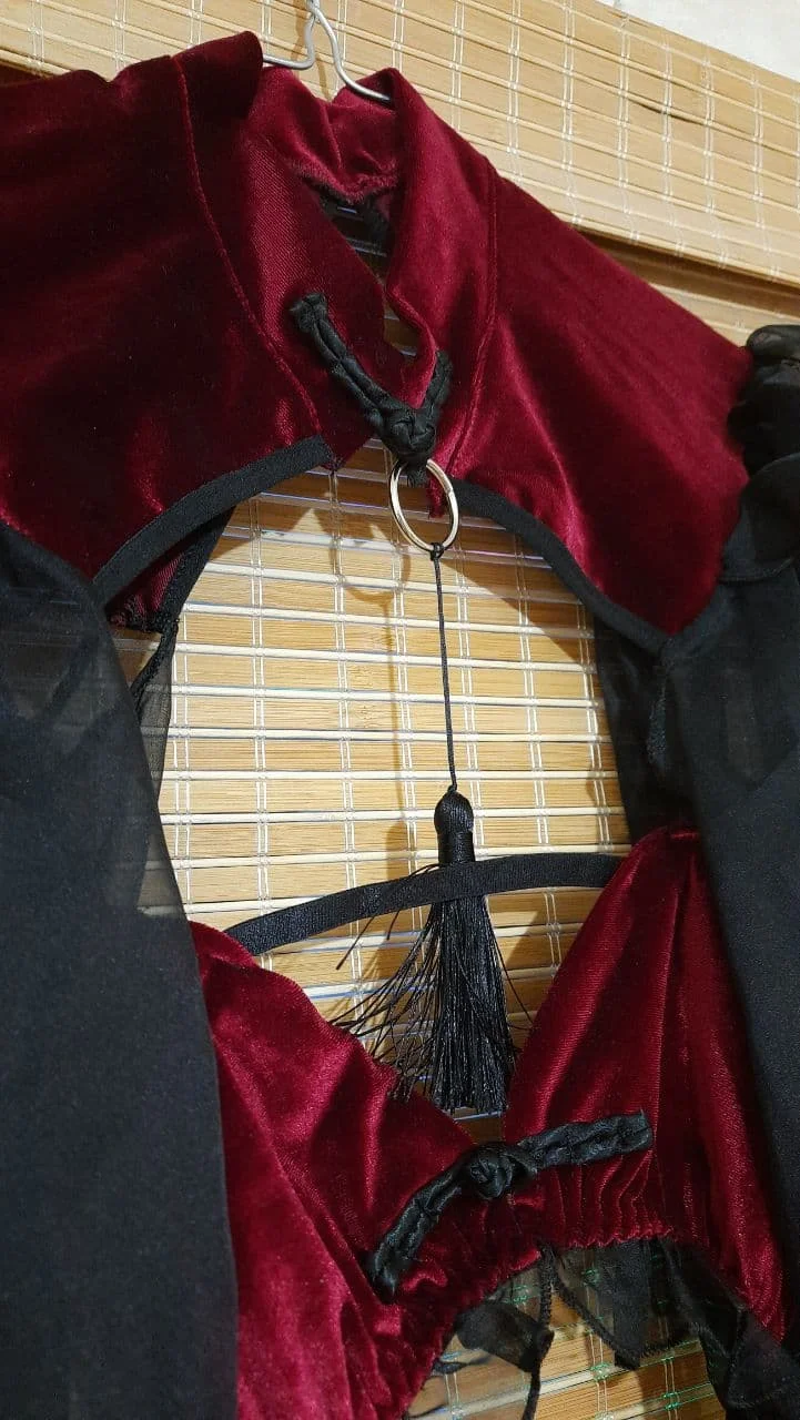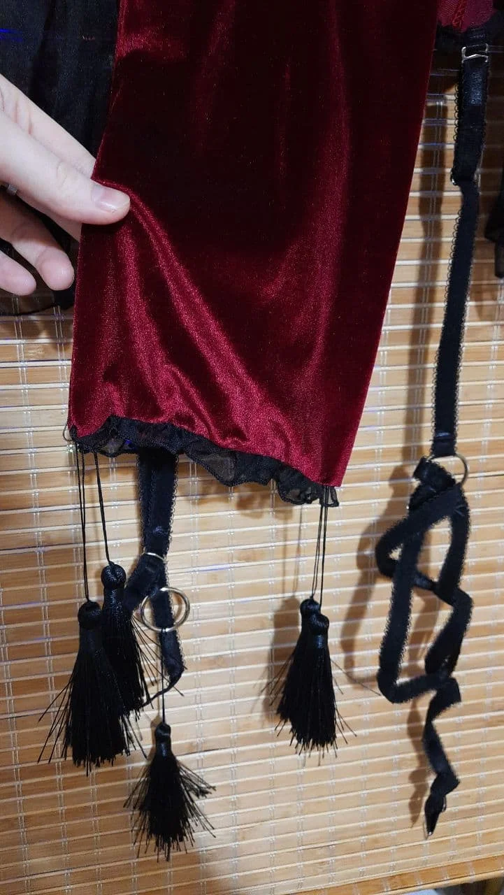 Доставка примерно две недели с отслеживанием. Нежнейшая бархатная ткань, отличная фурнитура, все швы ровные. Пошив на 10/10! Костюм желательно на стройных дам, но на мои 104-80-114 хорошо подошёл, только сделала дополнительный ряд под крючки на лифе, для большой груди маловато места. Ещё пришлось перешить одну кисточку, потому что её случайно застрочили на 2 см короче других, но это всё исправимо, снижать за такое не буду.