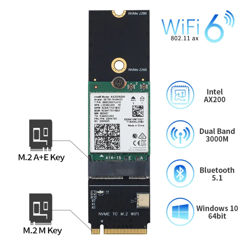 Беспроводная карта Wi-Fi 6, 3000 Мбитс, Bluetooth 5,1 M.2 Key M, адаптер Riser Card 802.11ax для Intel AX200 AX200NGW, беспроводная сетевая карта