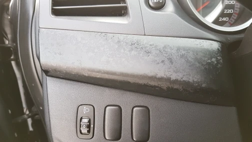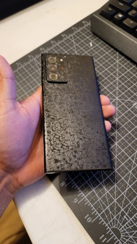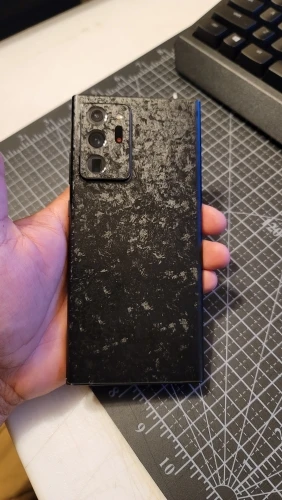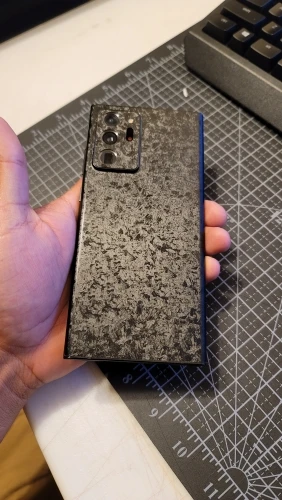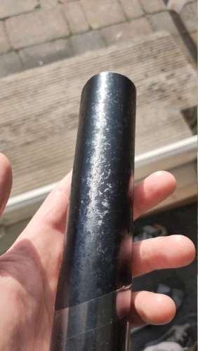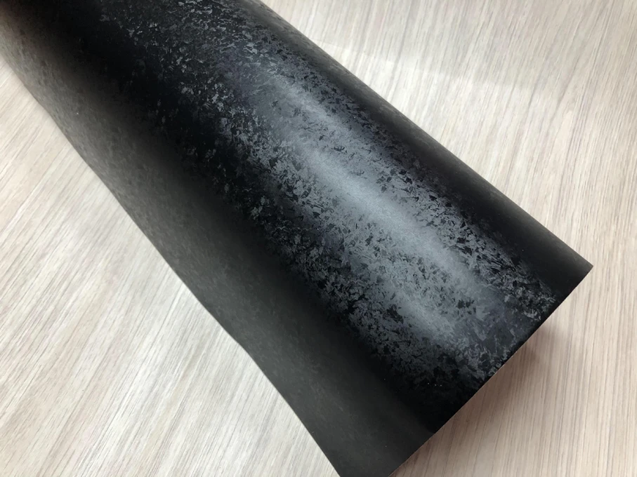 Упаковка надёжная, пупырка снаружи, сама пленка намотана на пластиковую тубу. Рисунок ломаного карбона не напечатан, а имеет фактуру, что очень хорошо. Пленка клеится легко, очень податливая, охотно тянется. При натяжении текстура довольно долго держится.