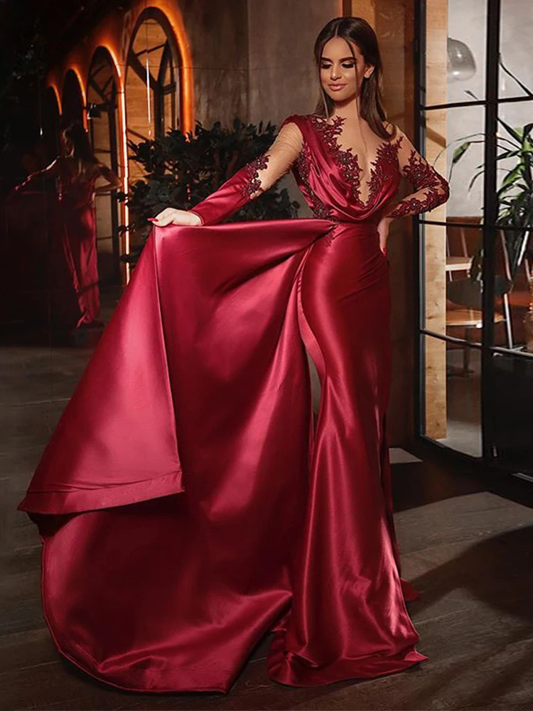 Элегантное Атласное Вечернее платье LORIE для женщин, бордовое кружевное платья знаменитостей, Русалка с аппликацией и длинным рукавом