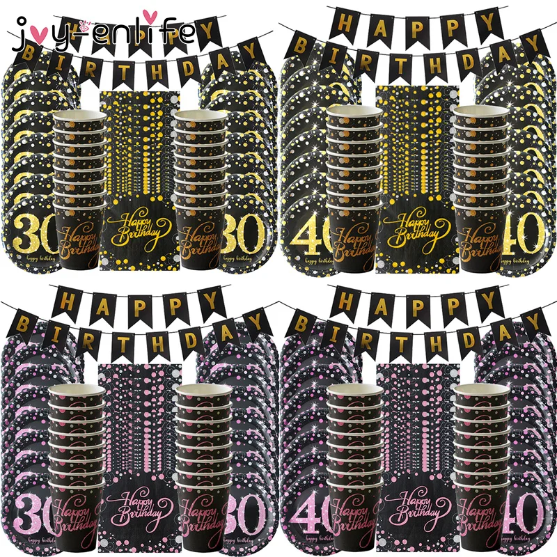 30 40 50 60th День рождения украшения для взрослых черного и золотого цвета для вечеринки день Святого Валентина День Валентина набор одноразовой посуды вечерние декоративная столовая посуда