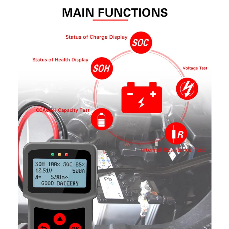 Этот тестер может легко, быстро и точно измерять фактический холодный стартовый ток пусковой батареи автомобиля, состояние здоровья самой батареи и общие неисправности запусковой системы автомобиля.
