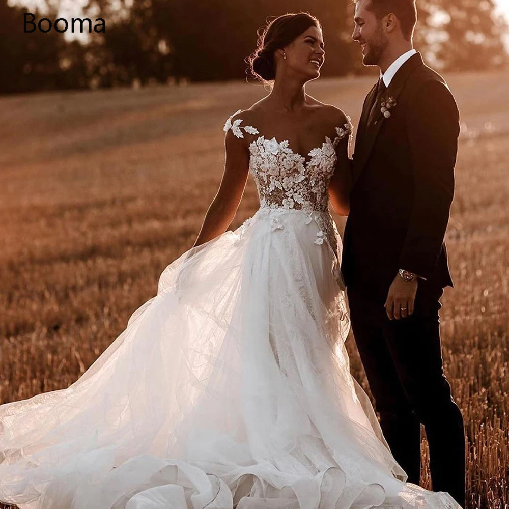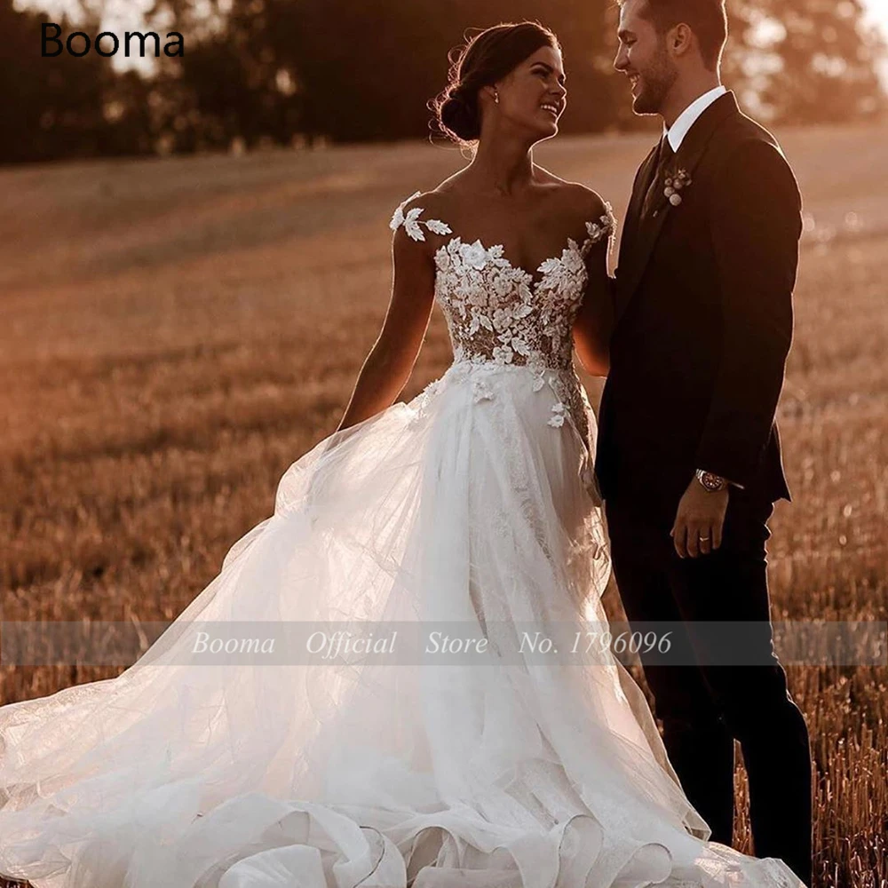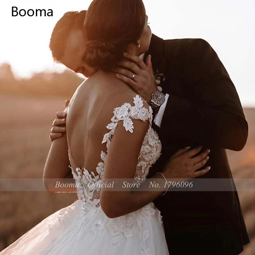 Простое кружевное свадебное платье с аппликацией, вышитое бисером, платья невесты с открытыми плечами, открытой спиной, трапециевидного силуэта, длинное свадебное платье