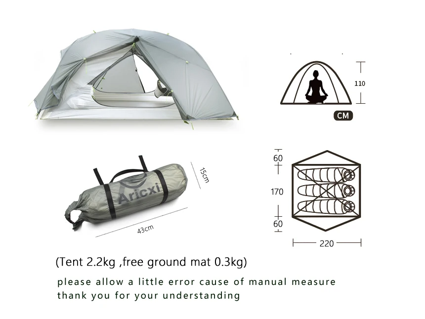 Палатка Aricxi 15D туристическая Ультралегкая, портативная двухслойная, для 3 человек, Всесезонная, водонепроницаемая