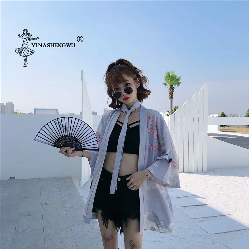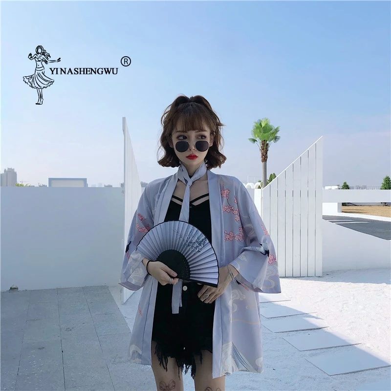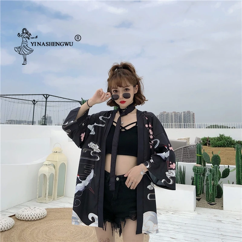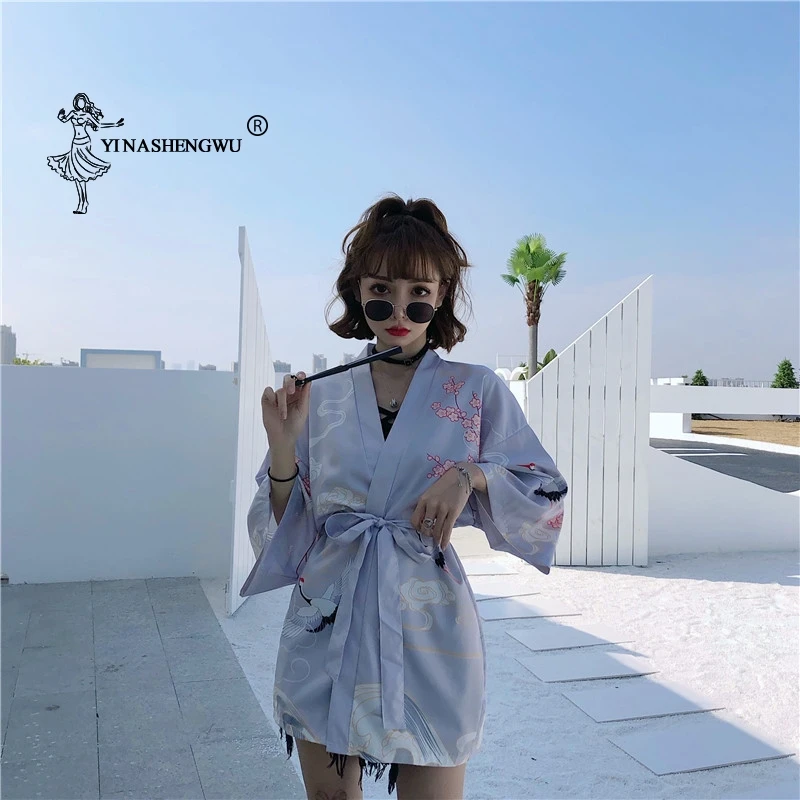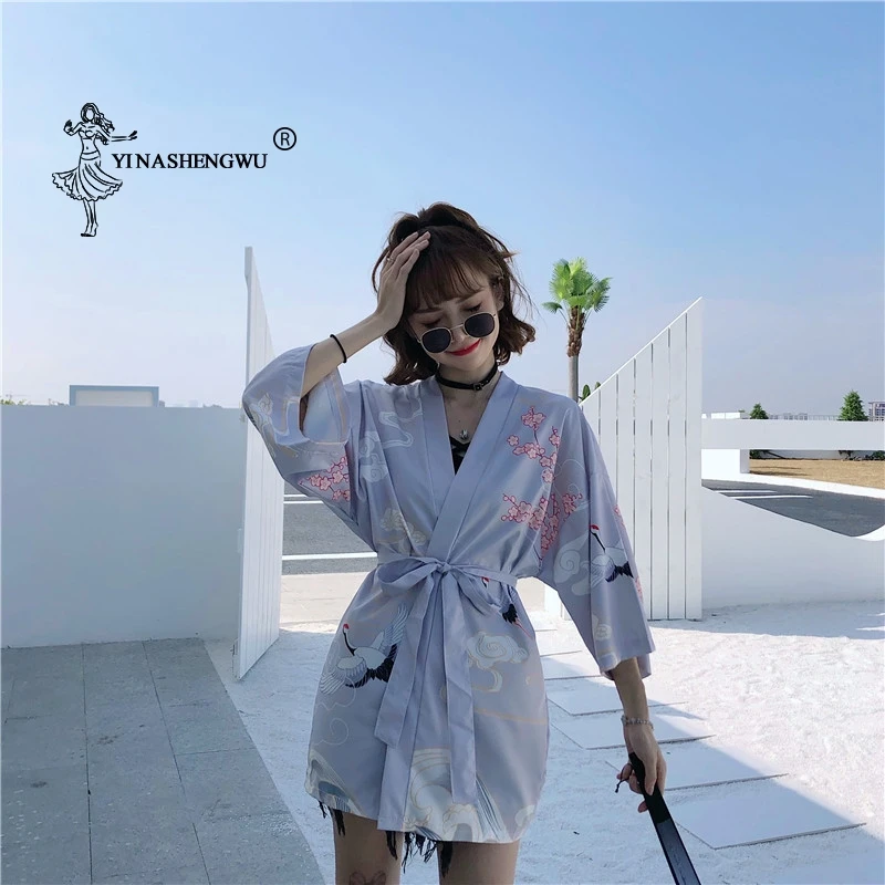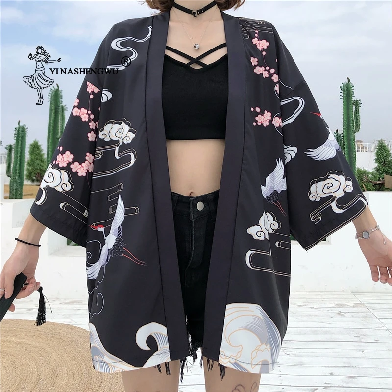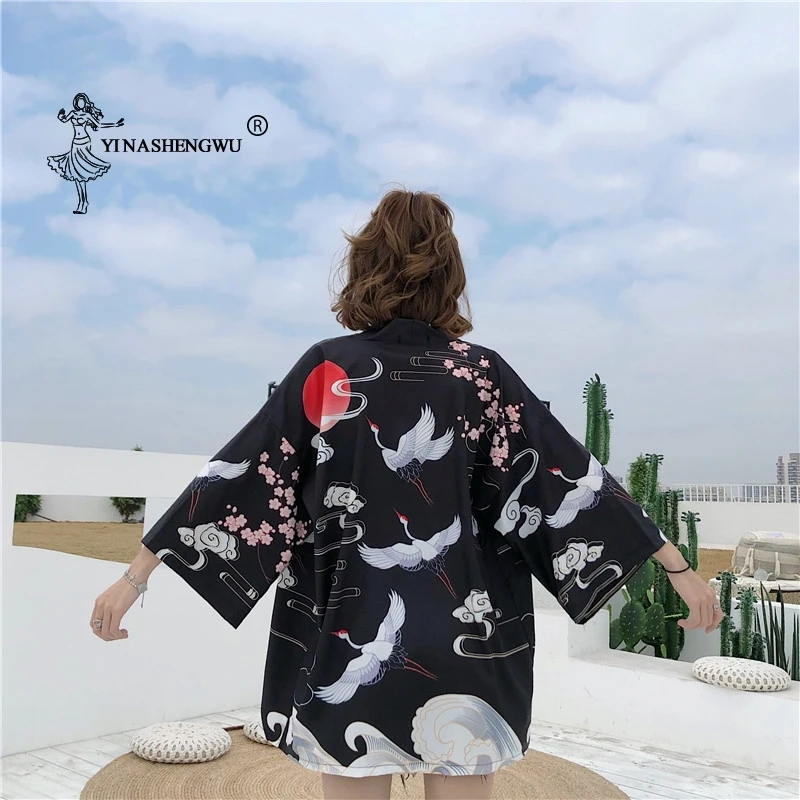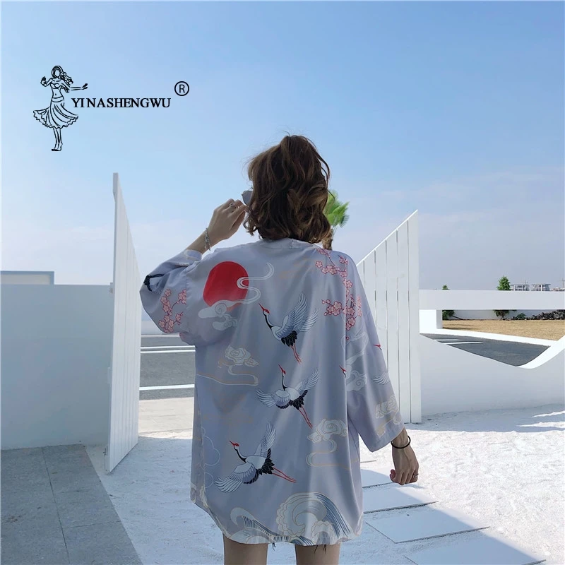 Кимоно женское с принтом облаков журавлей, Повседневный Кардиган в японском стиле, юката, азиатская Кимоно костюмы косплей, Пляжная рубашка, лето