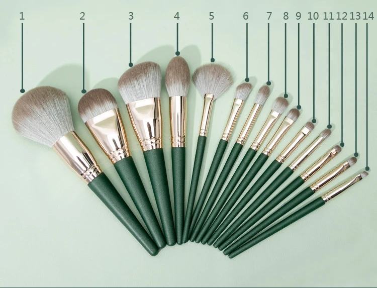 1. Кисть для пудры 2. Кисть для литья 3. Кисть для скульптуры 4. Кисть для румян 5. Щетка для хайлайтера 6. Кисть Noseshadow 7. Головка в виде пламени переходная щетка 8. Большая кисть для теней 9. Кисть для консилера 10. Маленькая кисть для теней 11.Eye socket brush 12. Детальная кисть 13,4 кисть для губ 14. Кисть для бровей