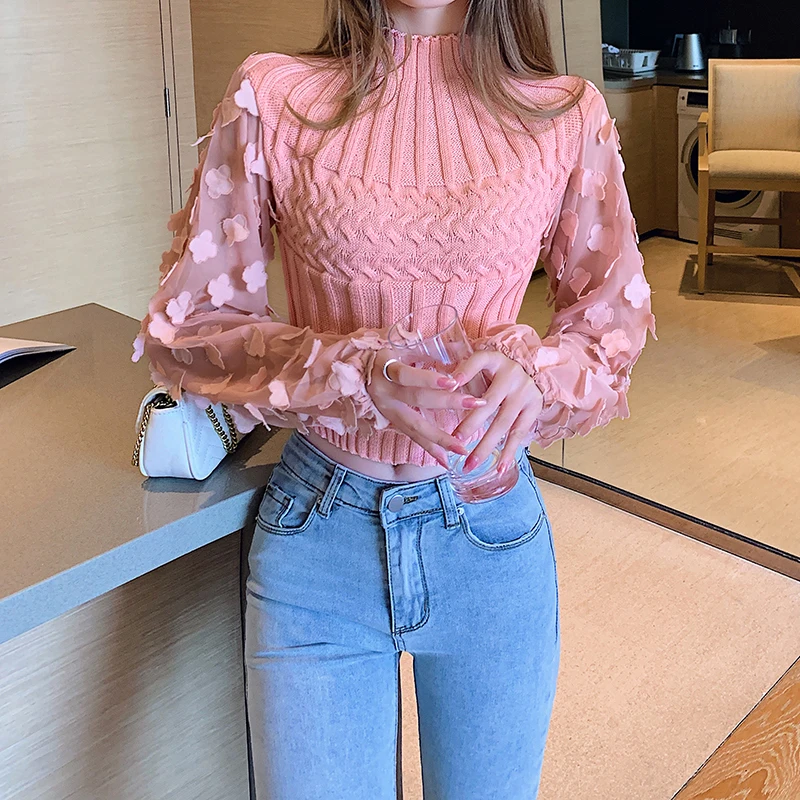 Свитер женский трикотажный, с длинным рукавом, розовый, Осень-зима 2020