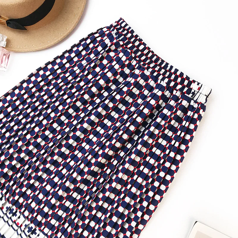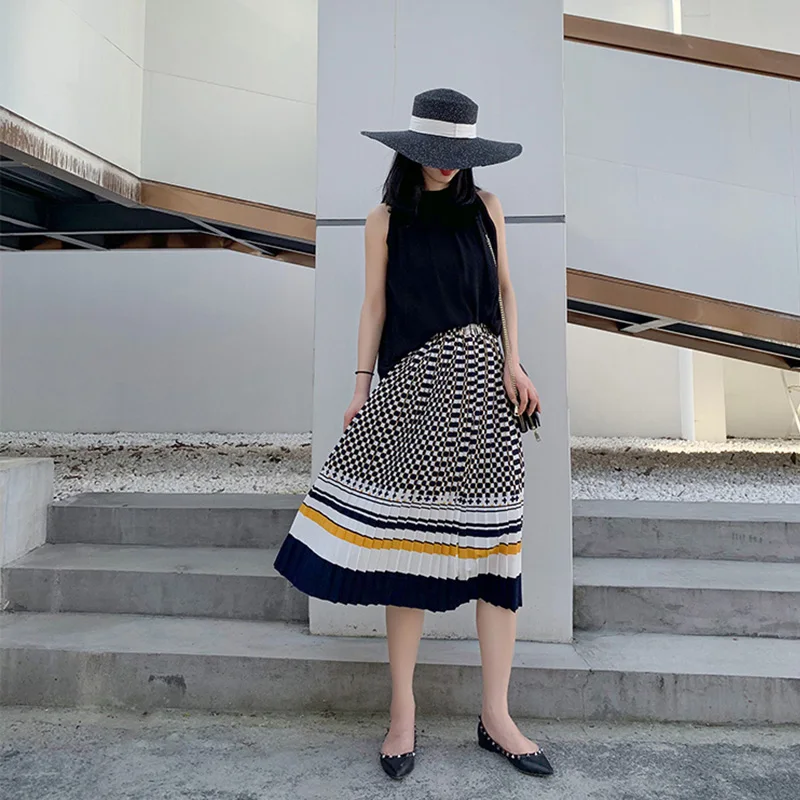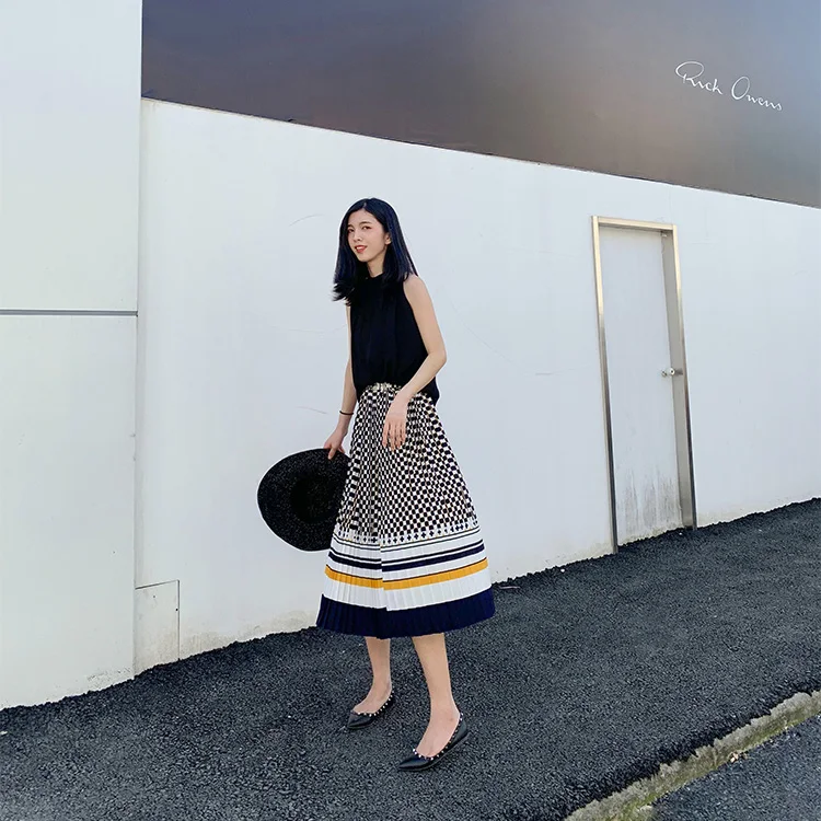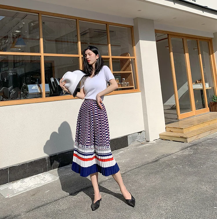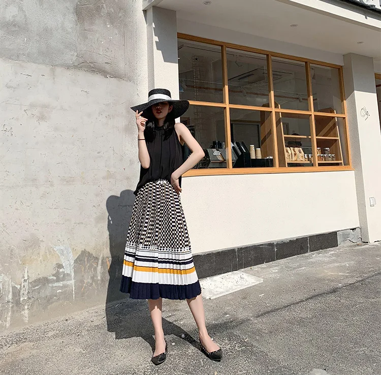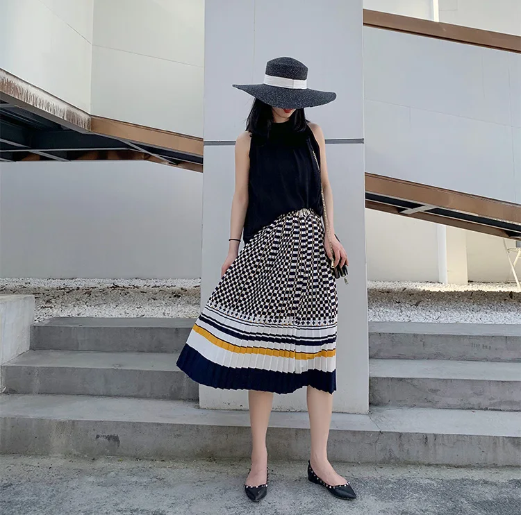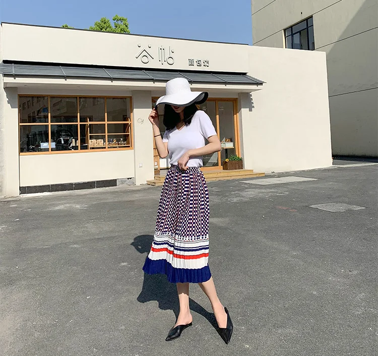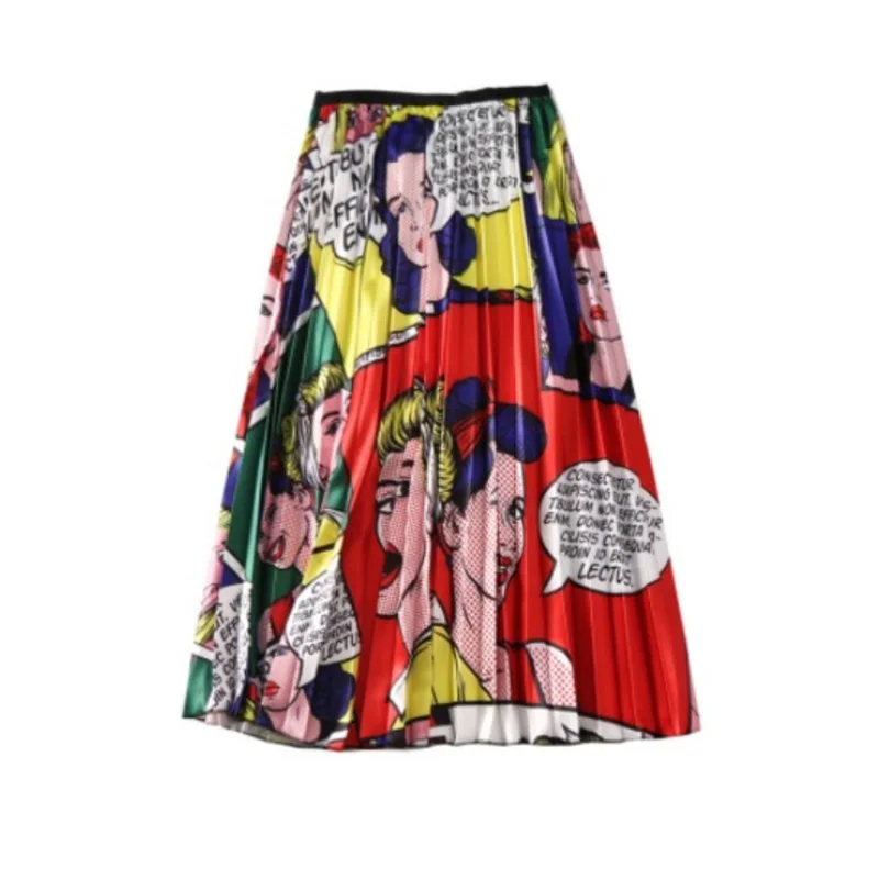 Юбка женская плиссированная с мультяшным рисунком, милая длинная юбка средней длины в полоску, горошек, с завышенной талией, качественная, Y2K, лето 2021