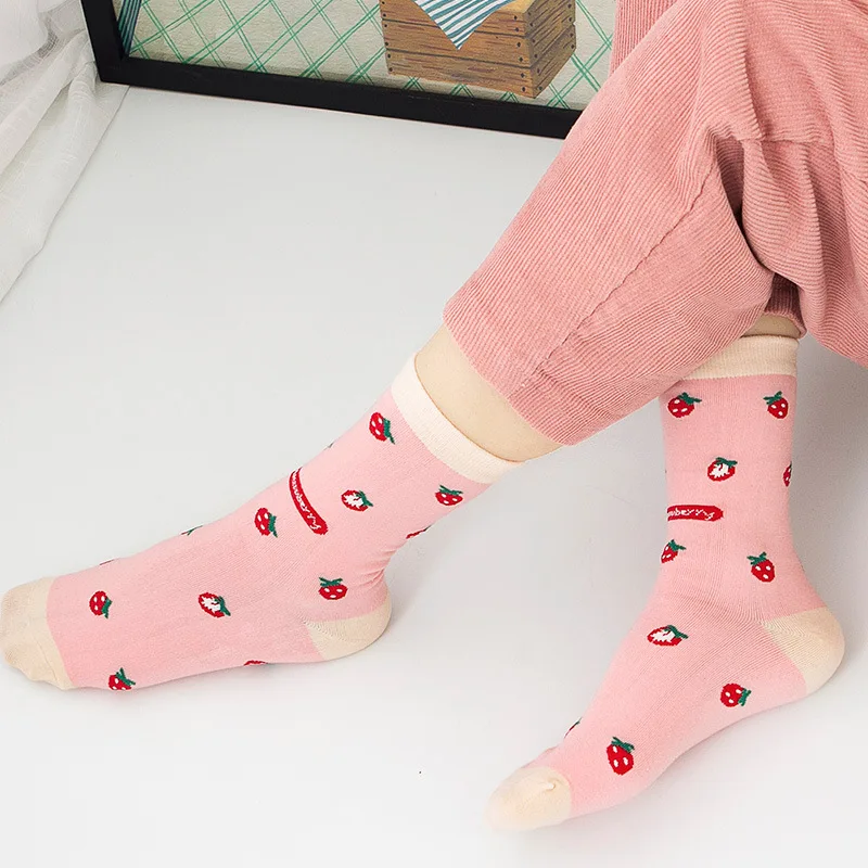 Розовые кавайные носки для женщин, носки с изображением клубники год, милые носки с героями мультфильмов