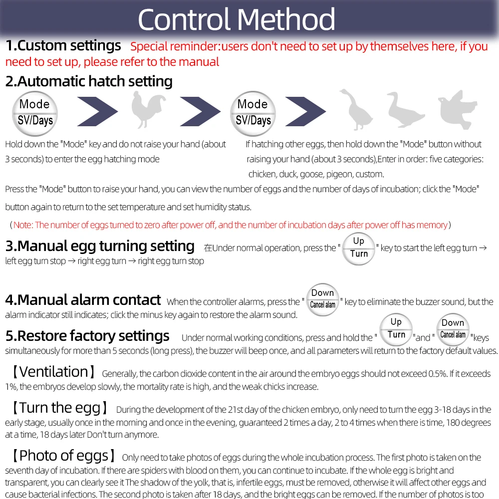 Интеллектуальный инкубатор-контроллер нового поколения, полностью интеллектуальная микрокомпьютерная система управления, разработанная и разработанная для инкубационной промышленности и iПрименяет новейшие микроэлектронные технологии и компоненты нового типа. Микрокомпьютерные чипы обладают сильной защитой от помех и высокой стабильной производительностью; Датчик температуры применяет высокоточный датчик, чтобы иметь высокую точность сбора температуры и широкий диапазон температур: он применяет высокоэффективный датчик влажности для высокой точности, чтобы эффективно обеспечить прочность и надежность. Он имеет дизайн удобных для пользователя четырех экранов Для отображения, включая два экрана, отображающие температуру и влажность инкубатора и других двух экранов, отображающие время поворота яйца и инкубационные дни, нажимая клавиши и показывая заданную температуру и влажность, нажимая кнопки. И пять видов инкубационных режимов для определения пользователя, доступны для выбора курицы, утки, гуся и голубя.