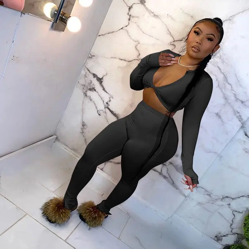 Спортивный костюм женский однотонный с V-образным вырезом, пикантный укороченный Топ с длинным рукавом и леггинсы с завязками, облегающий комплект из двух предметов, наряды для фитнеса
