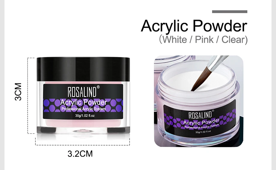 Характеристики Товара:Бренд: ROSALINDНазвание: кристаллический порошокОбъем: 10 г 30 гЦвет: 3 цветаИзлеченная: УФ/Светодиодная лампаИспользуется для: наращивания ногтей и резьбы ногтейВ комплекте: акриловый порошок * 3, акриловая жидкость * 2, стеклянная чашка * 1, акриловая кисть * 1Шаг за шагом:Шаг для наращивания ногтей:1. Нанесите базовый слой, вылечите светодиодный/УФ-лампой.2. Нанесите форму ногтя на ваш ноготь.3. Нанесите акриловый порошок акриловой жидкостью на гвоздь.4. Нанесите его на гвоздь. Подождите, пока он высохнет.5. Снимите форму ногтя.6. Обрежьте форму ваших ногтей.7. Нанесите верхнее покрытие, вылечите светодиодный/УФ-лампой.8. Отделка.Дизайн резьбы по ногтям шаг:1. Окуните кристаллический акриловый порошок акриловой жидкостью кисточкой.2. Приклейте его к ногтю и вырежьте. Подождите, пока он высохнет.3. Нанесите верхнее покрытие, вылечите светодиодный/УФ-лампой.4. Отделка.Примечание:1. Чистый объем составляет 30 г. Поскольку емкость бутылки составляет более 30 г, Кристальный акриловый порошок не будет полностью заполнен бутылкой.2. Плотно закрываются. Хранить в недоступном для детей месте.