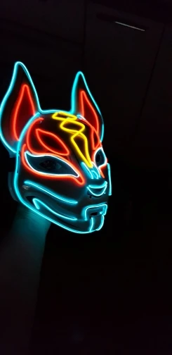Светодиодная маска с портативным источником питания, состоящий из двух аккумуляторов AA (не входят в комплект). Аккумулятор крепится с зажимом к поясу, когда кабель находится под этой одеждой, и это питает световую маску! Очень хорошо сделано, легко носить, если внутри имеется защитная пена, она идеально подходит для сезона Хэллоуин! Доставка в течение 17 дней для Бельгии и действительно хорошо защищена во время транспортировки