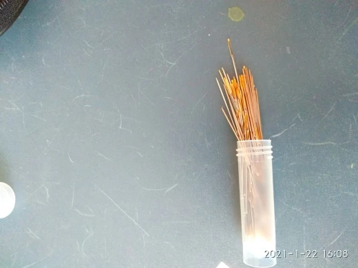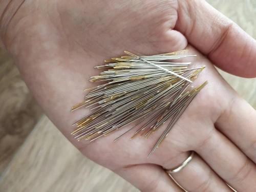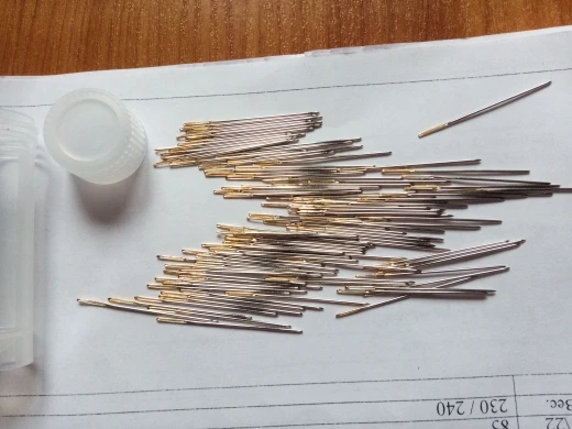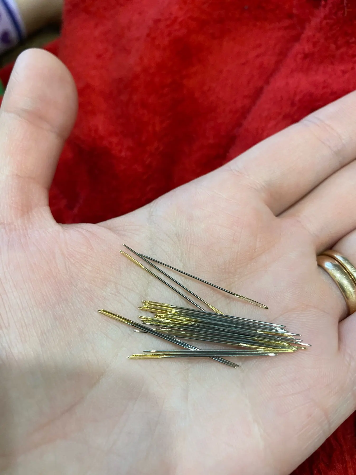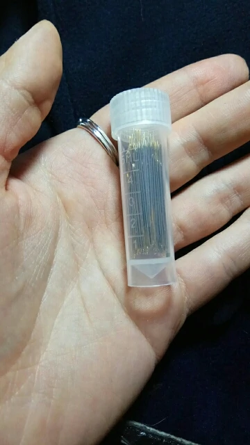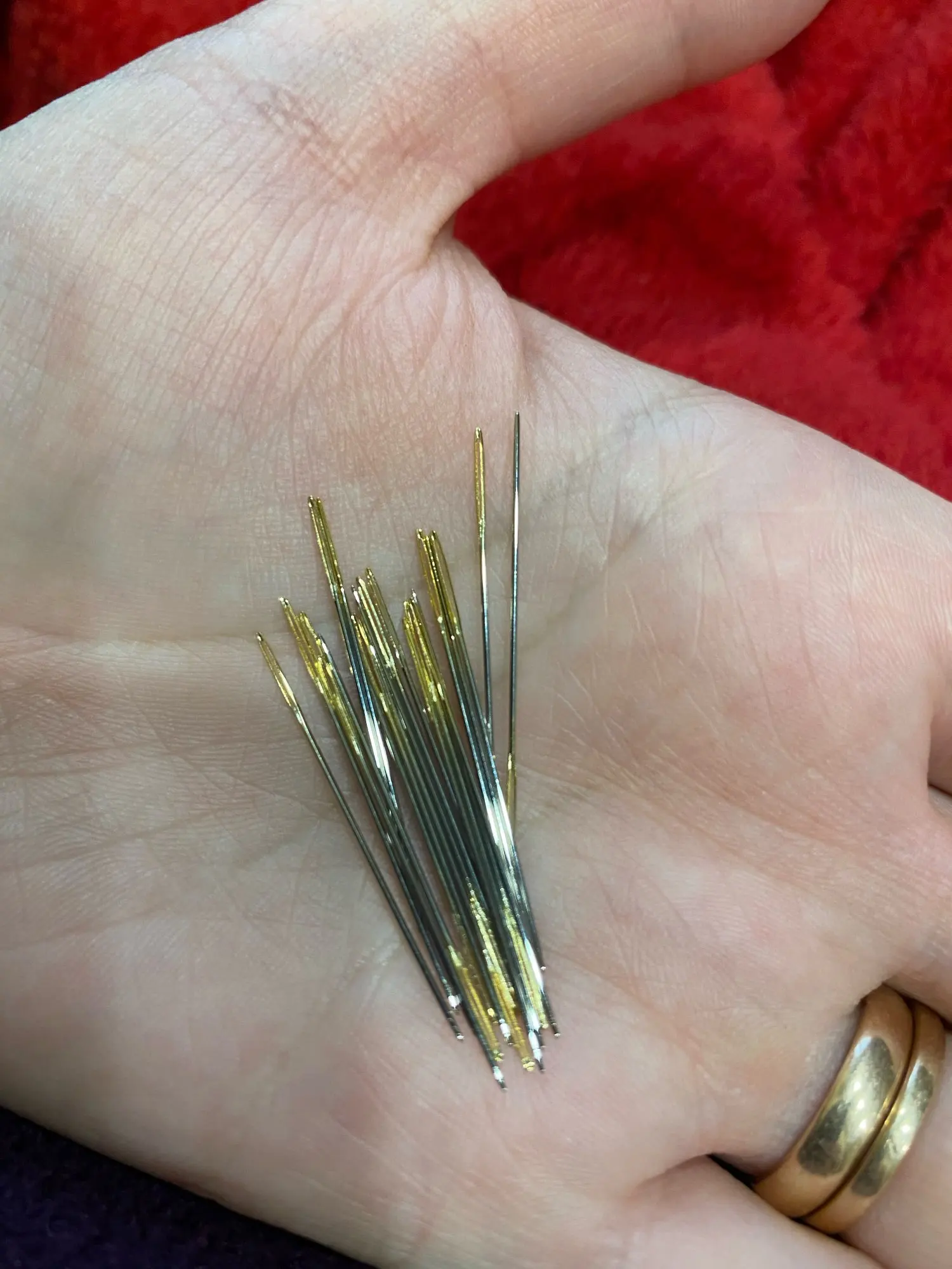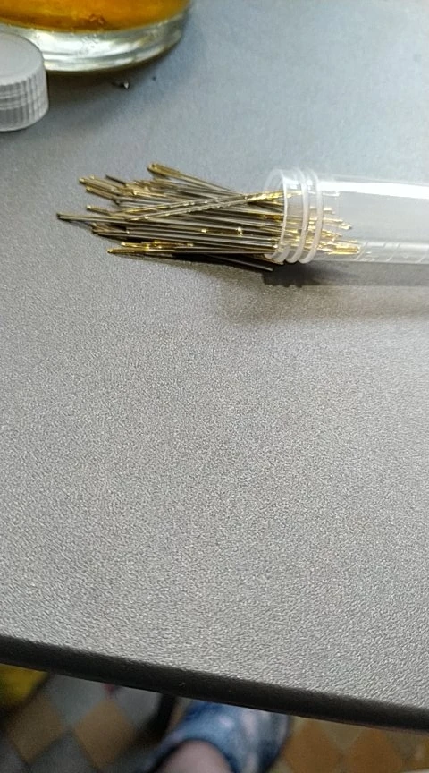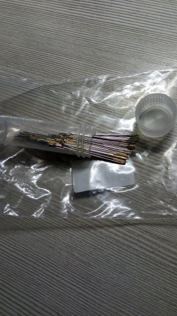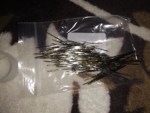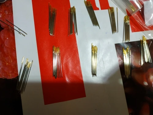 всего пришло 103 иголки, из которых предварительно я отбраковала 5 - 2 сломанных, у одной толстый кончик золотой (что-то перепутали при производстве видимо) и 2 с зазубринами. на первый взгляд качество у других иголок хорошее, в работе пока не пробовала. заказом довольна