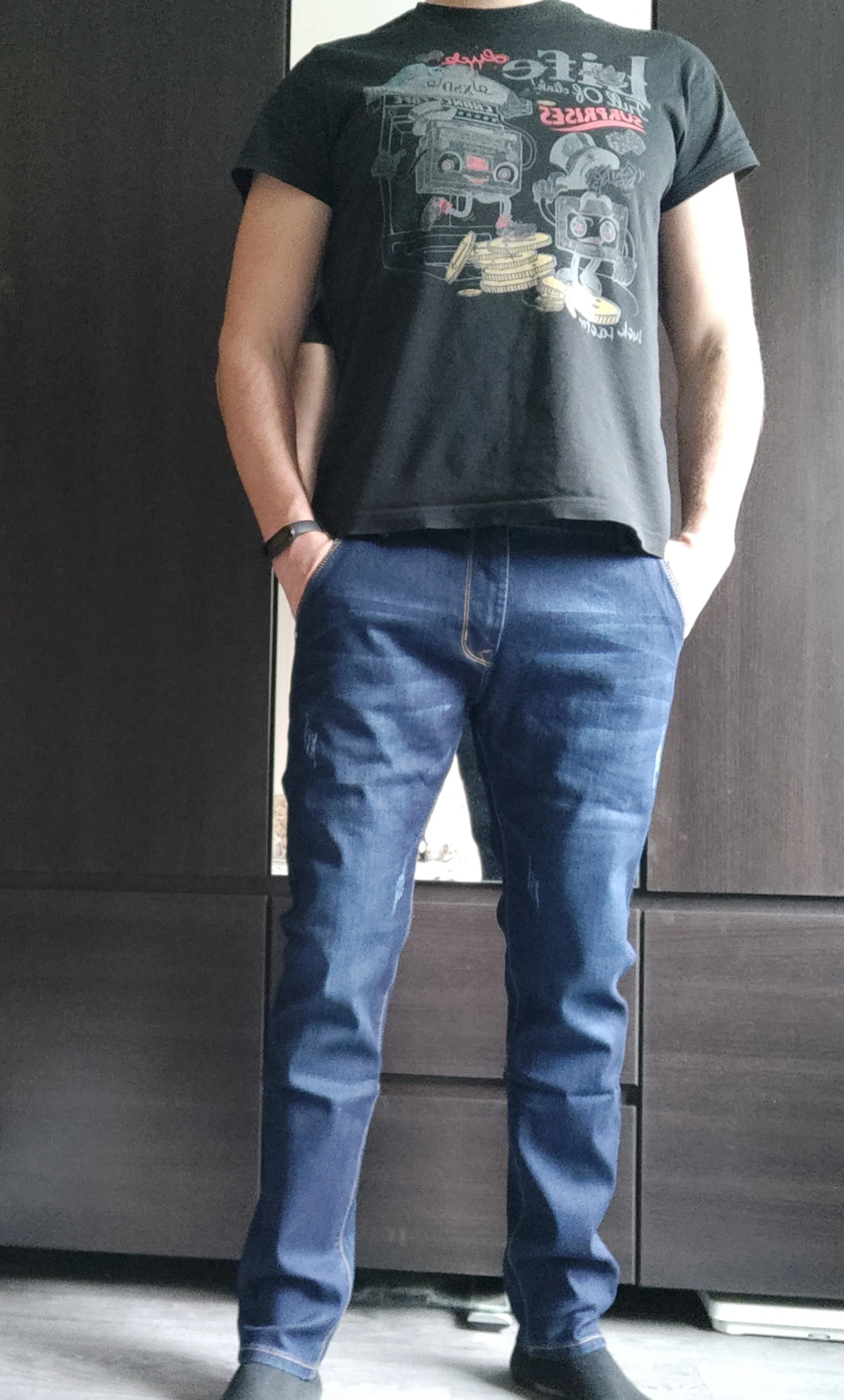 Качество приличное. Хорошо тянутся. Отличные ЛЕТНИЕ штаны. К джинсам не имеют отношения никакого. Размер суперсоответствует, впервые не пришлось подгонять под рост длину штанин. Покупкой в целом довольны.