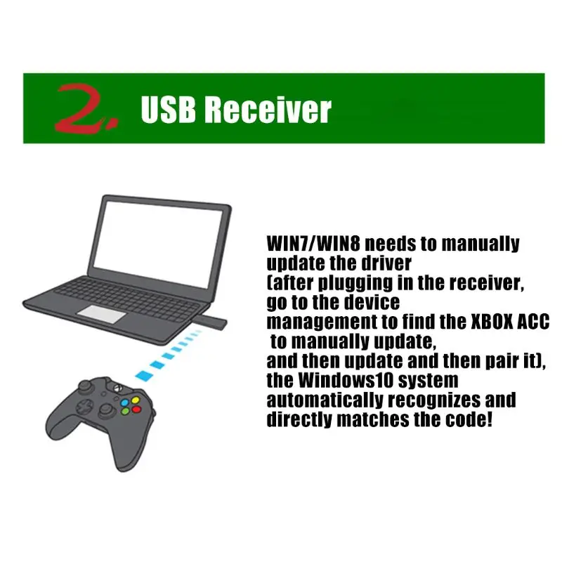 Описание:OOTDTY100% новый товар высокого качества.Характеристика:Подходит для WIN7/8/10 Системы.Беспроводное соединение Bluetooth, стабильная передача, высокая производительность.Подключайте и играйте через USB, подключайте, Сочетайте, используйте немедленно.Вы можете использовать до 8 контроллеров, 4 одноканальных наушников или 2 стереонаушников одновременно.Эргономичный дизайн, компактный и легкий, простой в использовании.Usb-приемник только для Xbox-ONE, другие аксессуары на фото не включены!Характеристики:Тип товара: приемник для Xbox-ONEМатериал: АБС-пластикРазмер: 1.8x0.8x5cmЦвет: черныйКоличество: 1 шт.Советы: компьютер должен быть системой Windows для использования!Оригинальные аутентичные все серии ручек являются обычными, WIN7 WIN8 должен вручную обновить драйвер (после подключения к ресиверу, перейдите в управление устройством, чтобы найти XBOX-ACC Обновление вручную, А затем сопряжение после успешного обновления)Система Windows 10 автоматически распознает код напрямую! Метод сопоставления кода:[Как использовать] подключите приемник, система windows автоматически распознает приемник, Установите батарею на ручке, И удерживайте кнопку беспроводного подключения на передней части ручки (то есть клавиша кода). В это время Кнопка X-BOX будет быстро мигать. Нажмите кнопку беспроводного подключения на боковой стороне беспроводного приемника, индикатор-светильник также будет мигать быстро, и вы можете использовать его после ожидания успешного подключения![Примечание] Если ваша система Windows была обновлена вручную, она все еще не может быть распознана или нет вибрации и т. д. это проблема с вашей компьютерной системой! Пожалуйста, обновите системный патч windows вашего компьютера, вы можете использовать включенное обновление windows или вы можете использовать 360 и другое программное обеспечение для патч, убедитесь, что примените все патчи, А затем перезагрузите компьютер, система windows настроит патч самостоятельно, вы можете решить проблему!Примечание:Нет розничной упаковки.Перевод ед. измерения: 1 см = 10 мм = 0,39 дюймовВозможны отклонения в 0-1 см вследствие измерений вручную. Пожалуйста, убедитесь, что вы не возражаете, прежде чем сделать ставку.Из-за разницы между различными мониторами изображение может не отражать фактический цвет изделия. Спасибо!Посылка включает в себя:1 usb-приемник