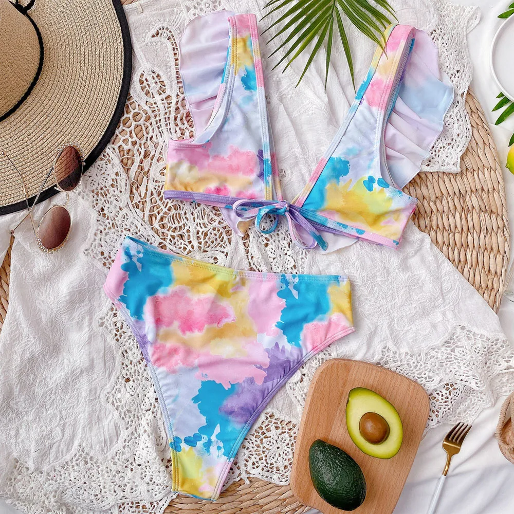 Новый женский купальный костюм с оборками и принтом, бикини с завышенной талией, женская одежда для плавания, комплект бикини из двух предметов, купальный костюм для купания