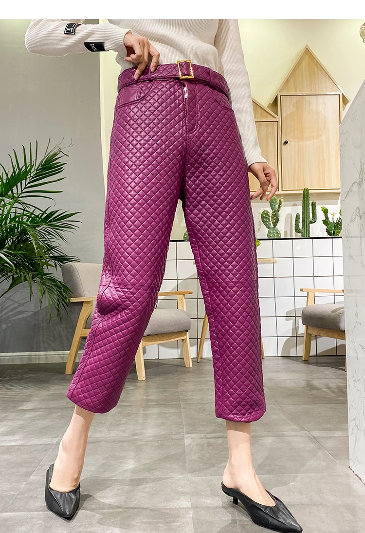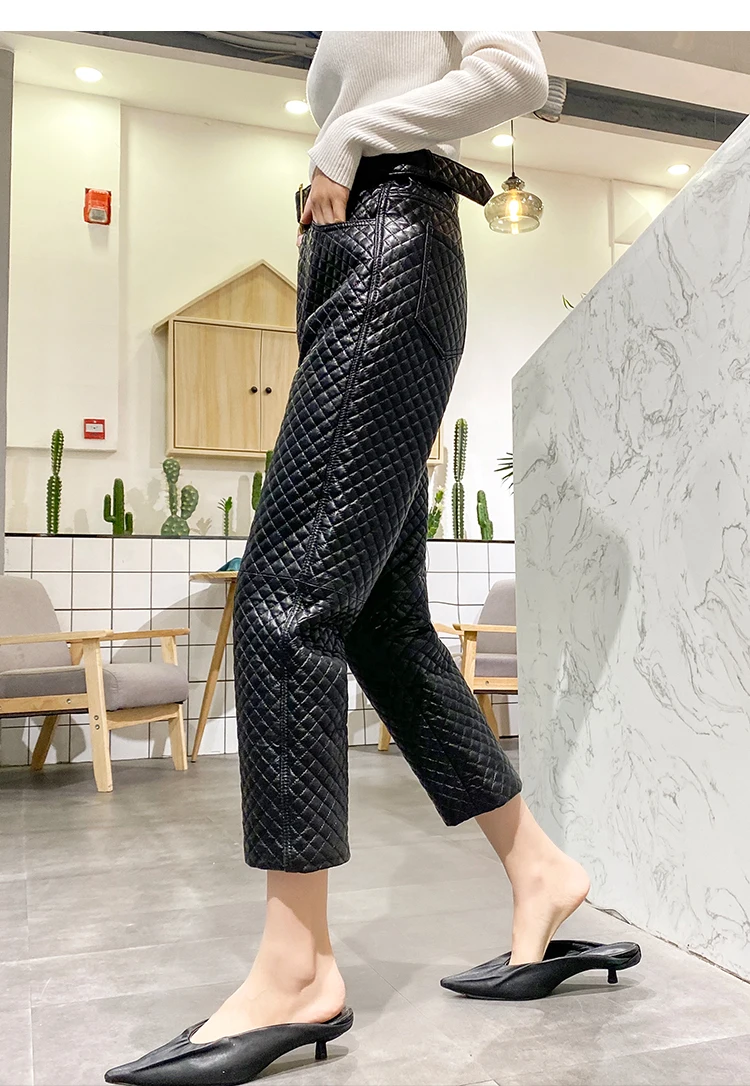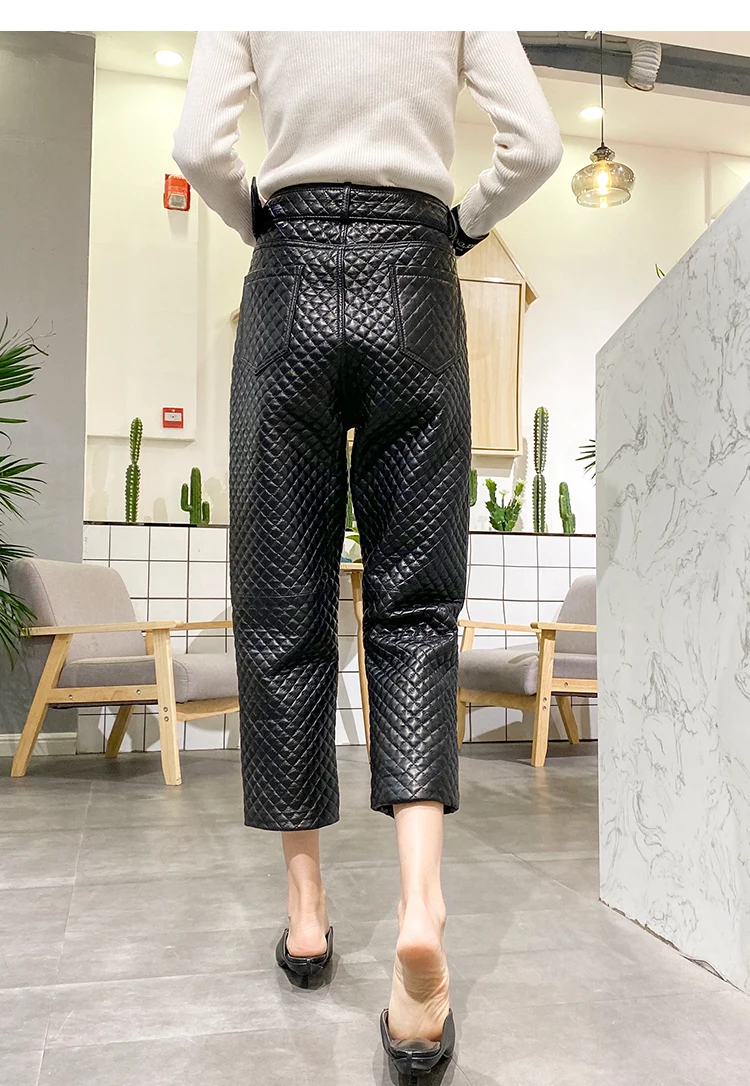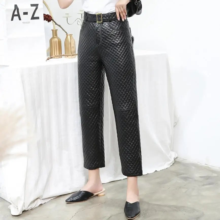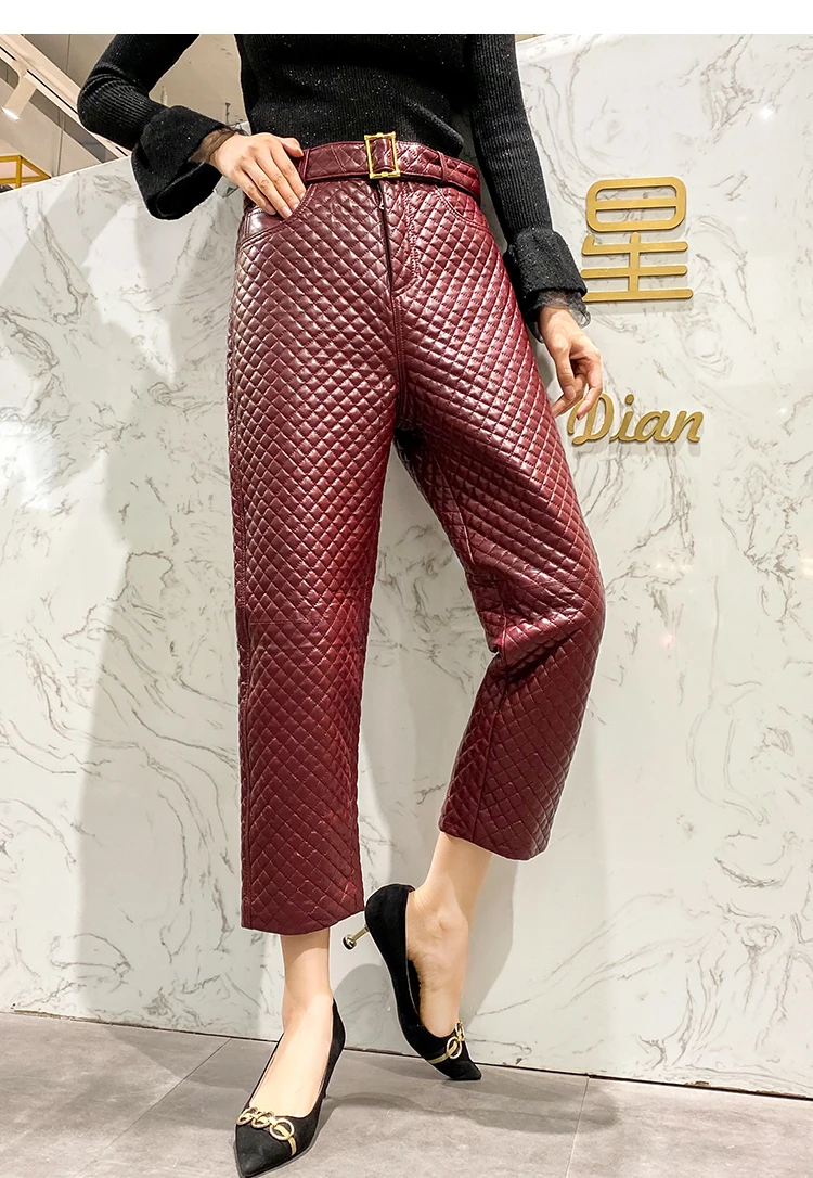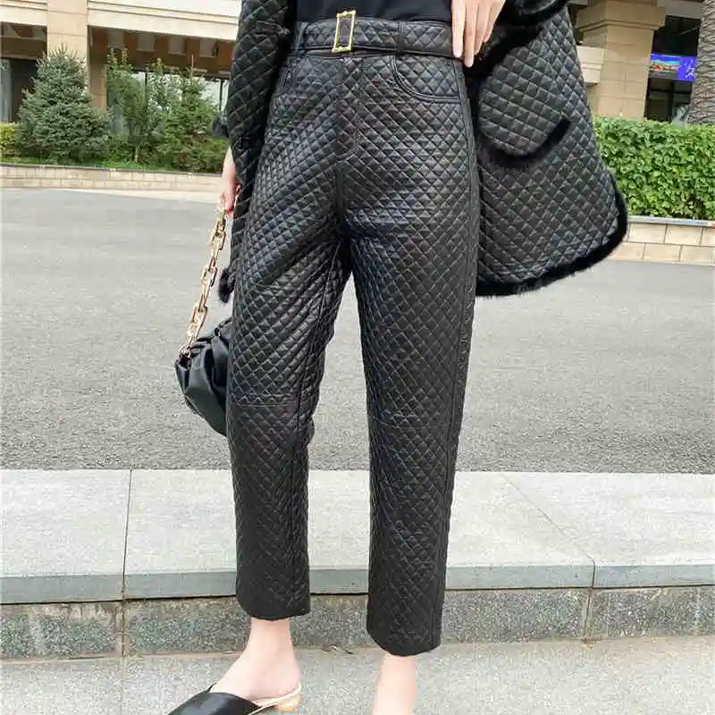 Брюки из натуральной кожи, со стразами, плотные теплые брюки из натуральной овечьей кожи, женские тонкие кожаные брюки с поясом F2154
