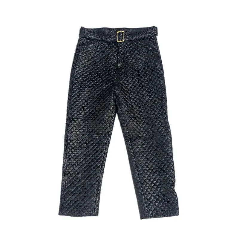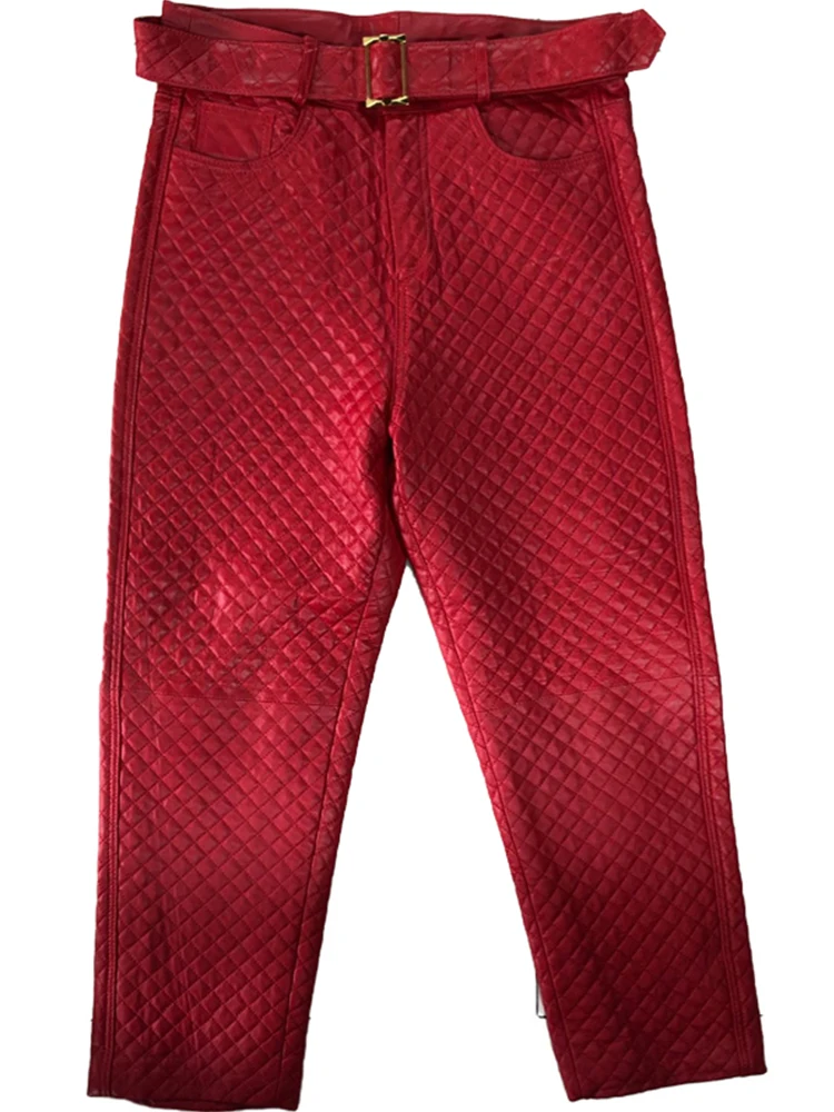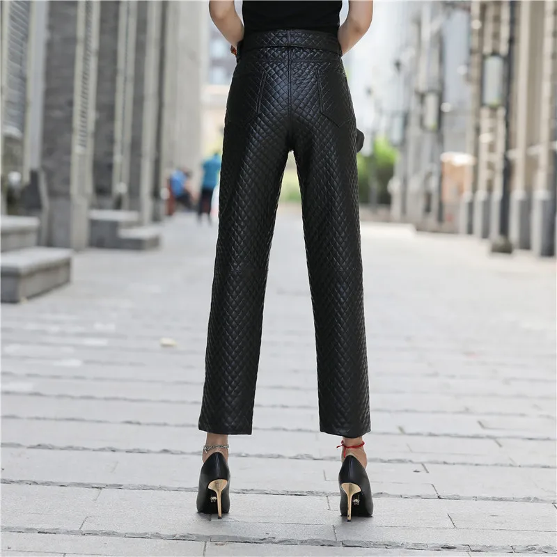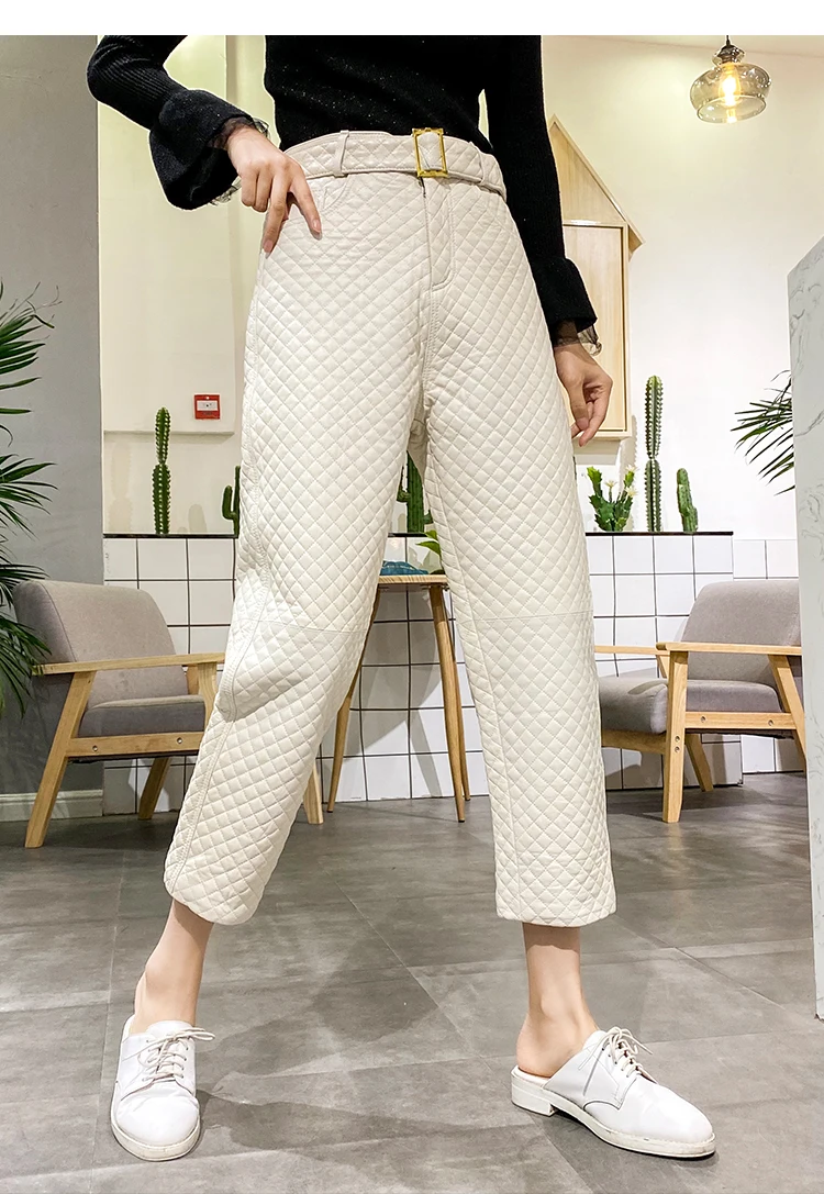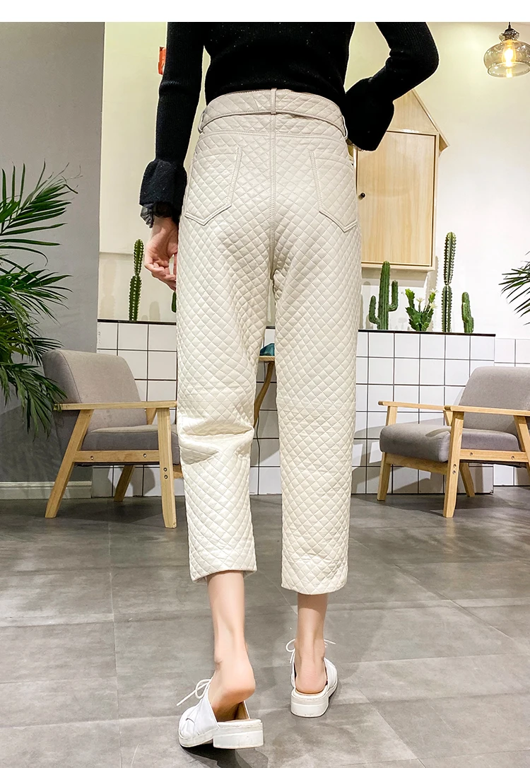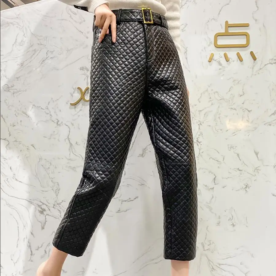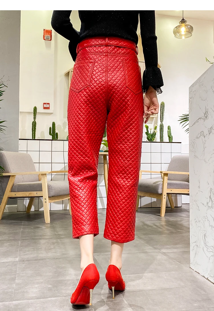 Брюки из натуральной кожи, со стразами, плотные теплые брюки из натуральной овечьей кожи, женские тонкие кожаные брюки с поясом F2154