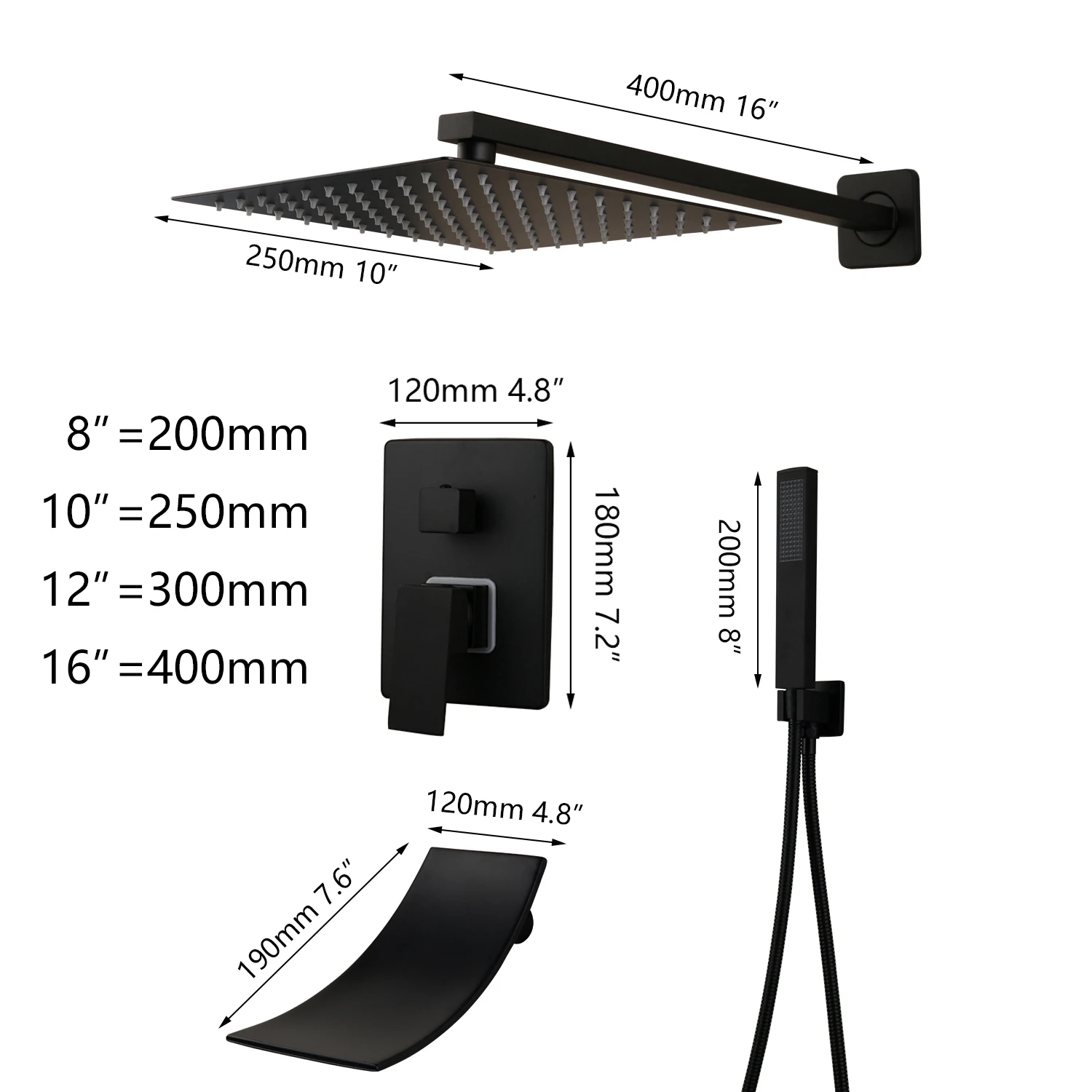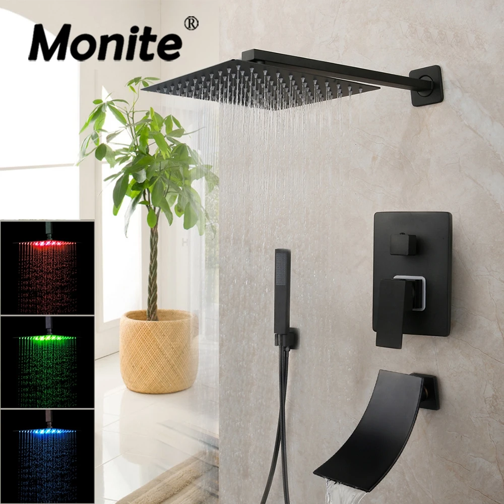 Monite, 8, 12, 16 дюймов, матовый черный смеситель для душа, ванна с дождевой насадкой, светодиодный, для дождя, квадратная насадка для душа, водопад, смеситель для душа, набор