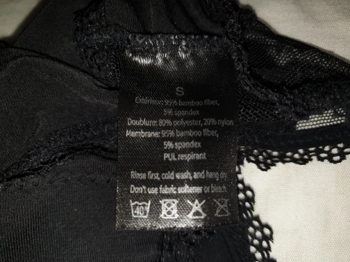 Je ne les ai pas encore testées mais elles ont l'air assez protectrices. Le design est un peu simple mais jolie. Je suis un peu septique à propos de la qualité du tissus et surtout de la dentelle dans le temps. Mais je ne suis pas sûre de trouver mieux facilement. J'ai pris la taille L et elle est bien taillée, comme ce que j'ai pu voir dans un autre commentaire et pour du L. Pour l'instant je les ai lavées une fois à la machine et elles ne se sont pas abîmées, je lave toujours ma lingerie à 30°C, dans un filet pour linge. Ce n'est qu'une fois donc ce n'est pas forcément représentatif mais au moins pour l'instant ça n'a pas bougé et pas décoloré non plus. La présence des coutures à l'arrière pour la doublure ne fait pas naturelle, c'est aussi dû au fait que ce n'est pas la même épaisseur que le tissu qu'il y a sur les côtés. Au niveau de la conception ce n'est pas si mal. Le tissu est doux. Sur l'étiquette il y a écrit extérieur : 95% bamboo fiber, 5% spandex, ... ça m'étonne un peu.