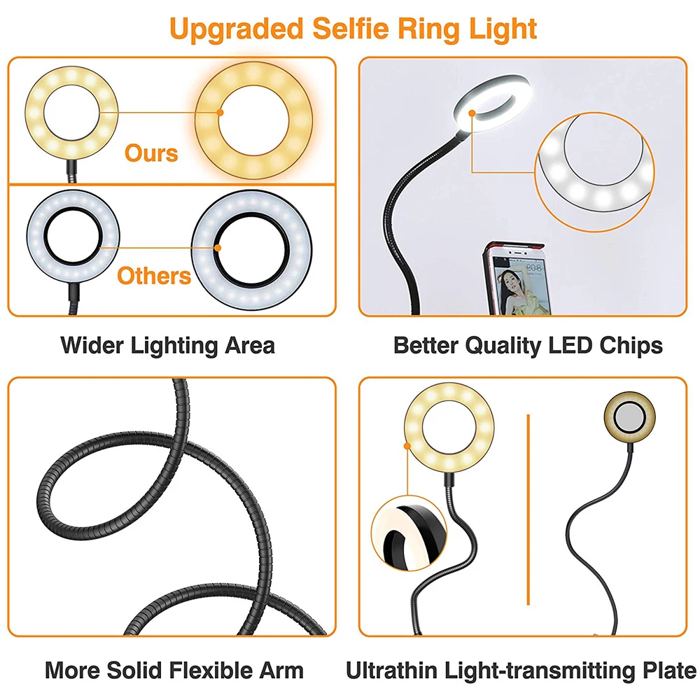 ✔Зажимайте руками на столе/кровати и Поворачивайте под любым углом, чтобы освободить руки✔3 светильник-белый, теплый желтый + белый✔10-уровневая яркость-оптимизируйте источник освещения как можно лучше✔Регулируемая на 360 градусов-поворотная шаровая Головка легко вращается для идеального просмотра✔Универсальный держатель для телефона-работает со всеми смартфонами iPhone/Samsung шириной до 3,6 дюймов✔Питание от USB-батарея не требуется, длинный USB-кабель (55 дюймов) обеспечивает достаточный доступ к USB-зарядному устройству✔Многофункциональность-работает как кольцевой светильник для фотосъемки, так и настольная лампа или даже моносветильник Па✔Прочный-качественный прочный материал для долговечности/стабильности✔Резиновый зажим для подушки-Противоскользящий/противоударный для стабильности и защищает ваш стол или стол