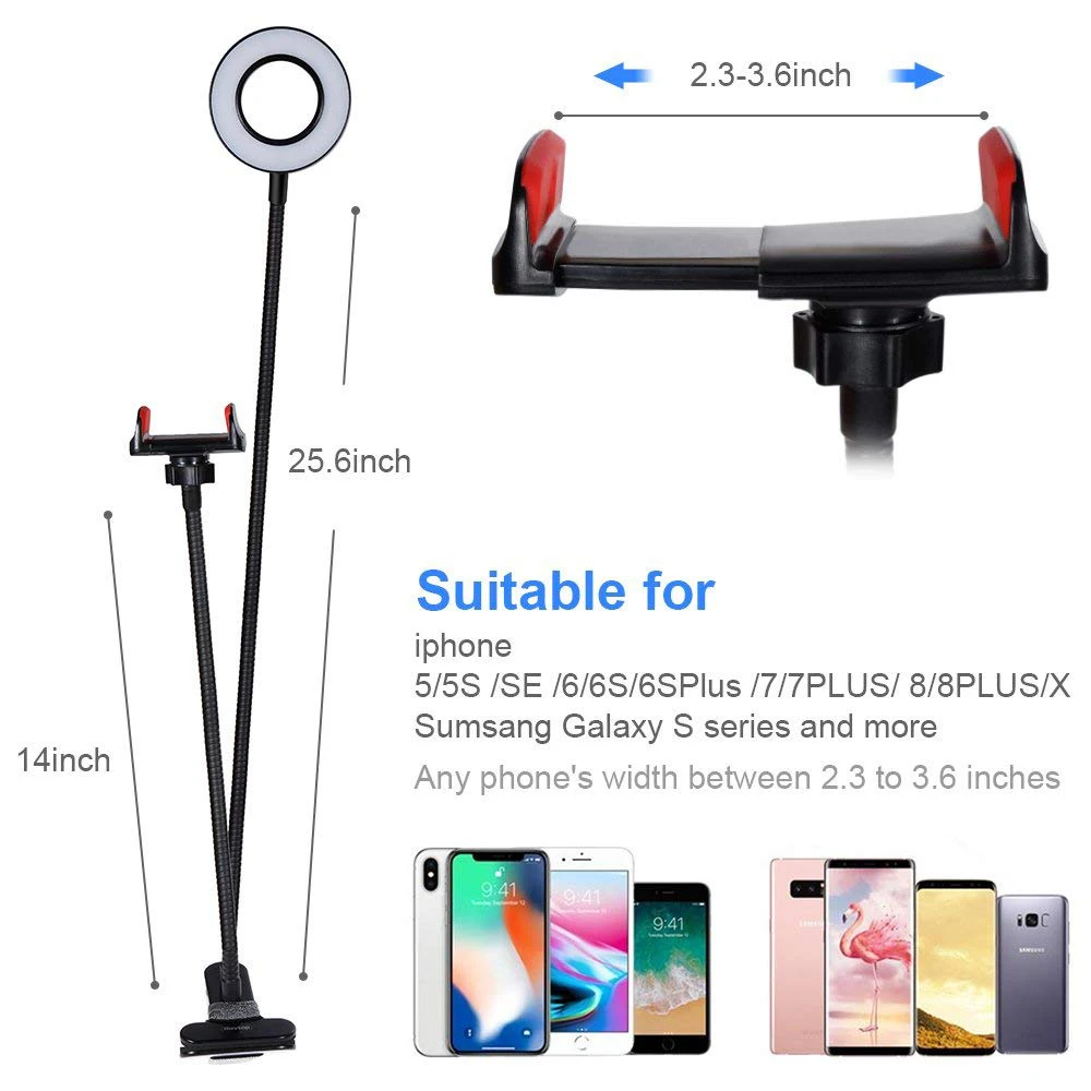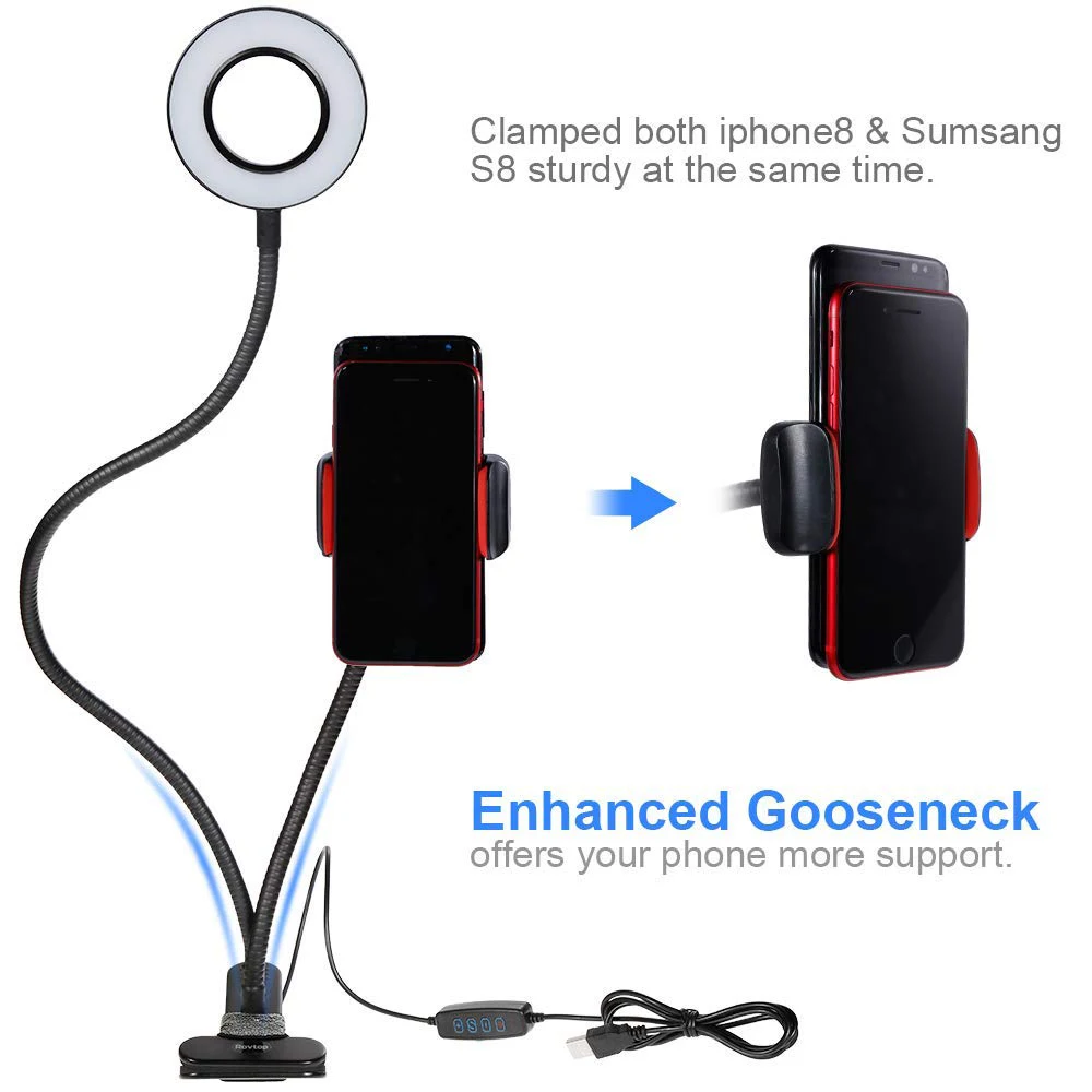 Светодиодный кольцевой светильник с зажимом для селфи с держателем для сотового телефона 2 в 1, гибкая Регулируемая лампа для макияжа, настольная лампа, фотостудия для прямого эфира