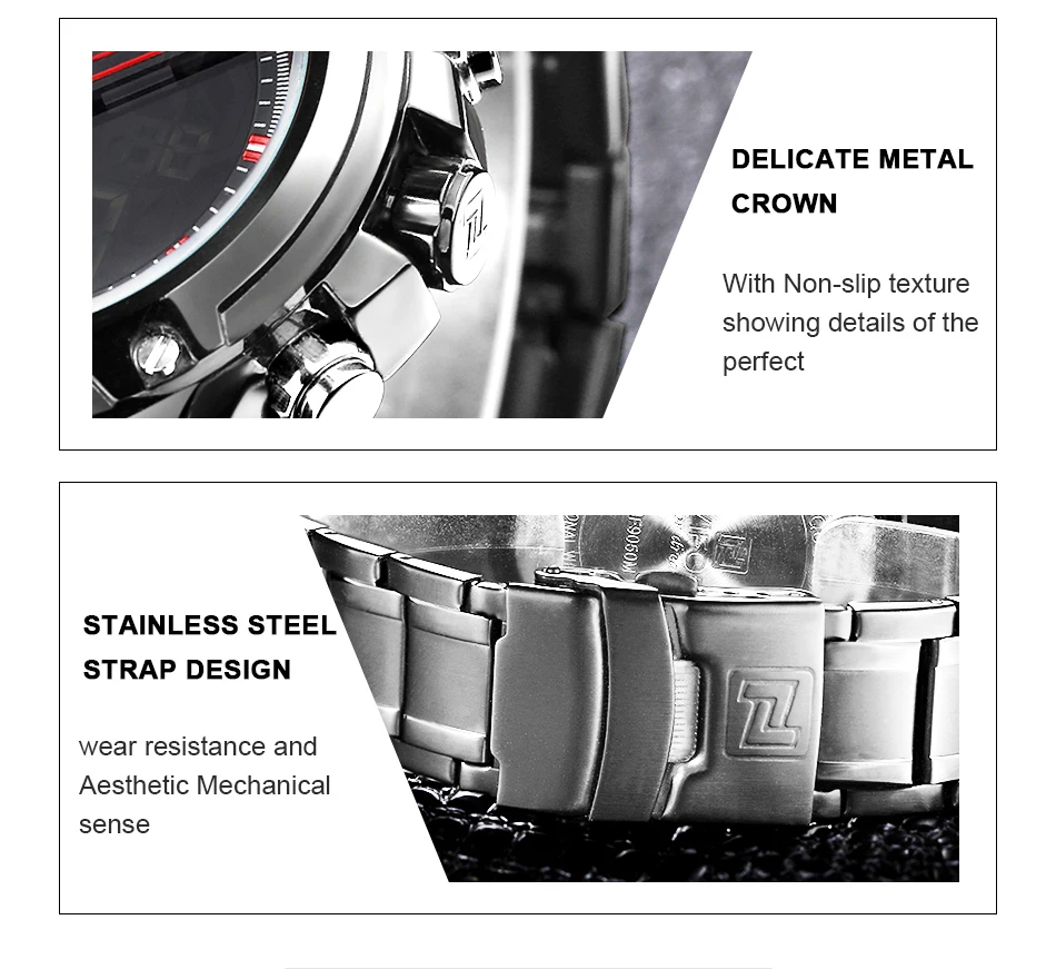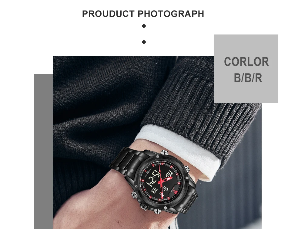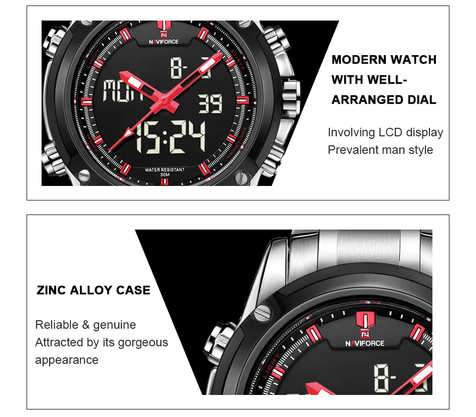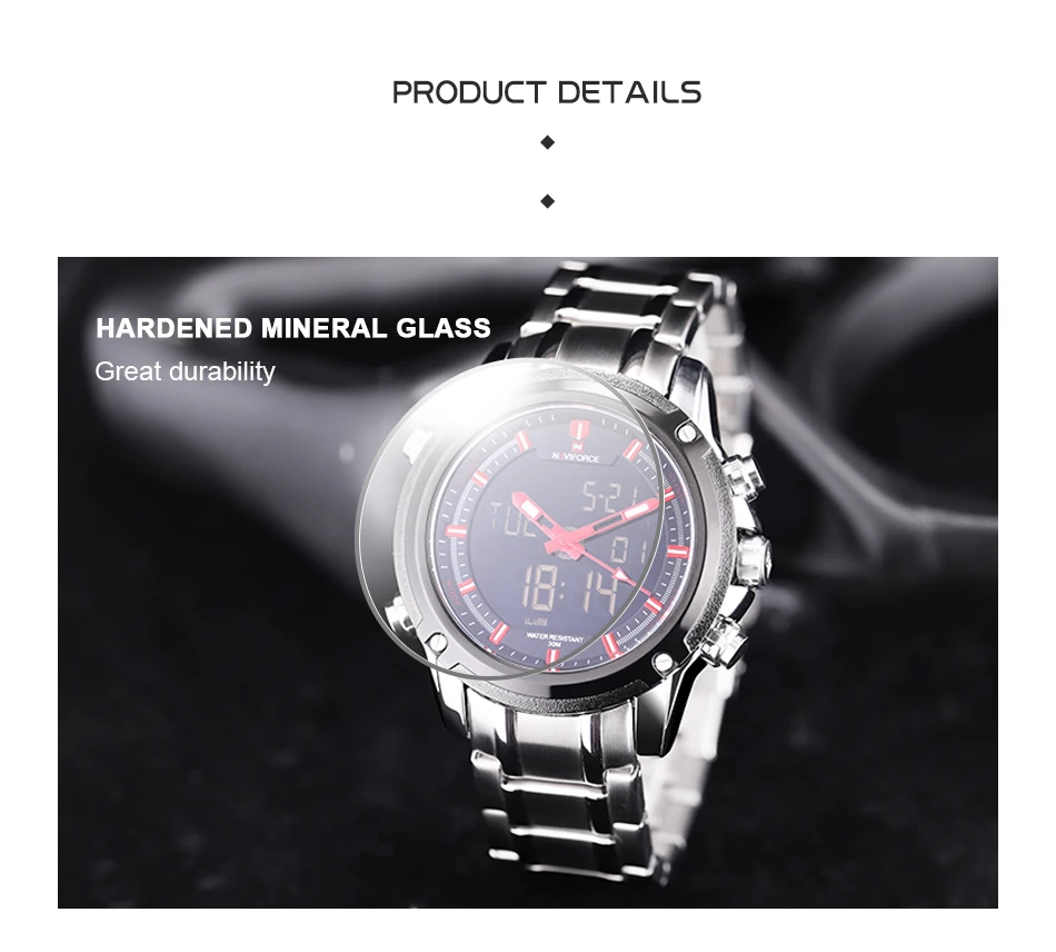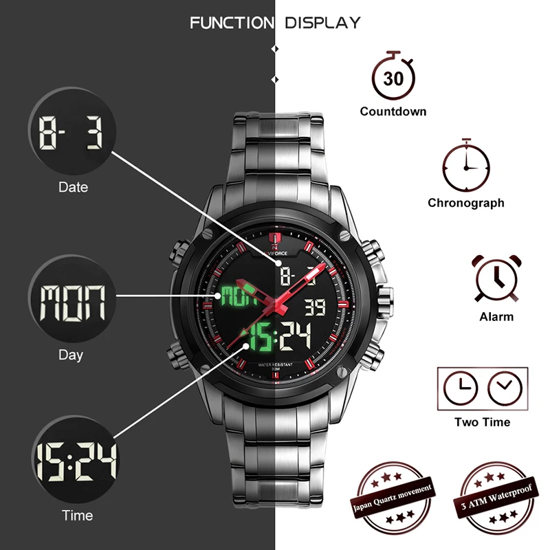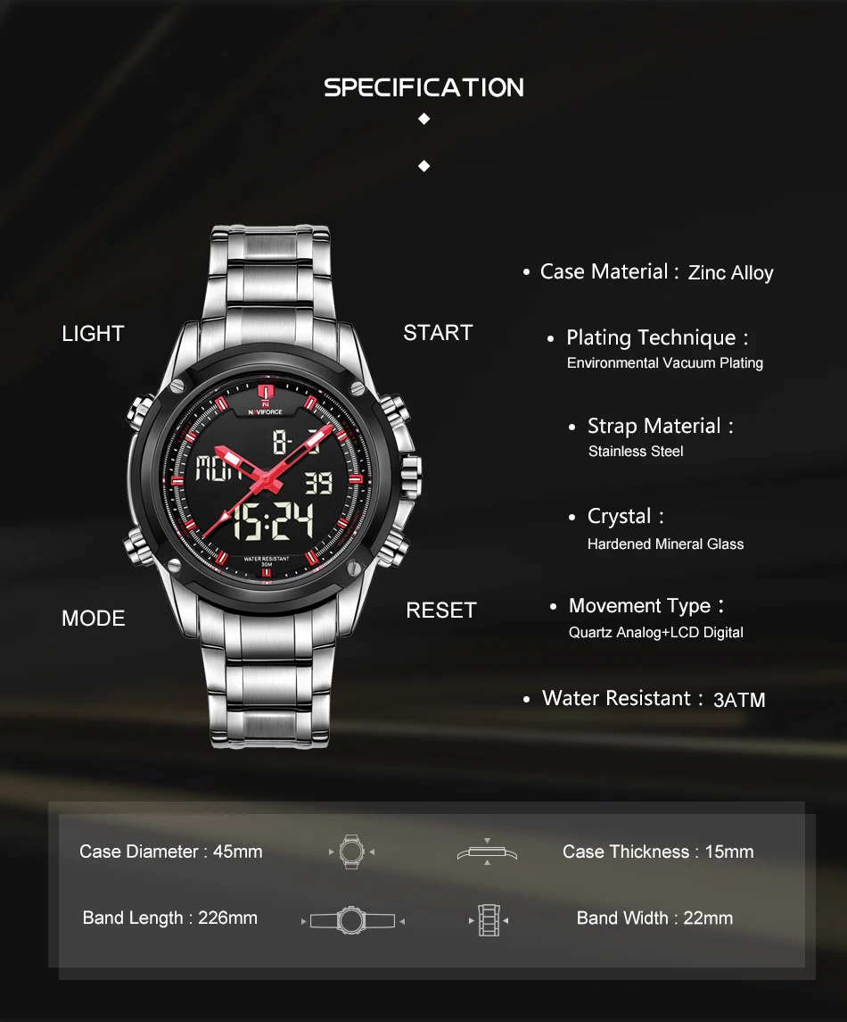 Описание100% новые и высококачественныеСигнал тревоги с 4 мин., Повтор сигналаОтображение дня, даты и времениChrime на каждый часХронограф с работой на 1/100 кругаДвухъядерныйАналоговый и цифровой дисплейФункция EL (синий)Функция ежечасного звонкаБраслет из нержавеющей сталиВодостойкийХарактеристикиМатериал корпуса: нержавеющая стальДиаметр корпуса: 43 ммТолщина корпуса: 15 ммМатериал ремешка: нержавеющая стальДлина ремешка (включая чехол): 226 ммШирина ремешка: 24 ммВес: 172 гЧто входит100% новый бренд NAVIFORCE1 аналоговый и цифровой дисплей с будильником и синими часами с функцией EL