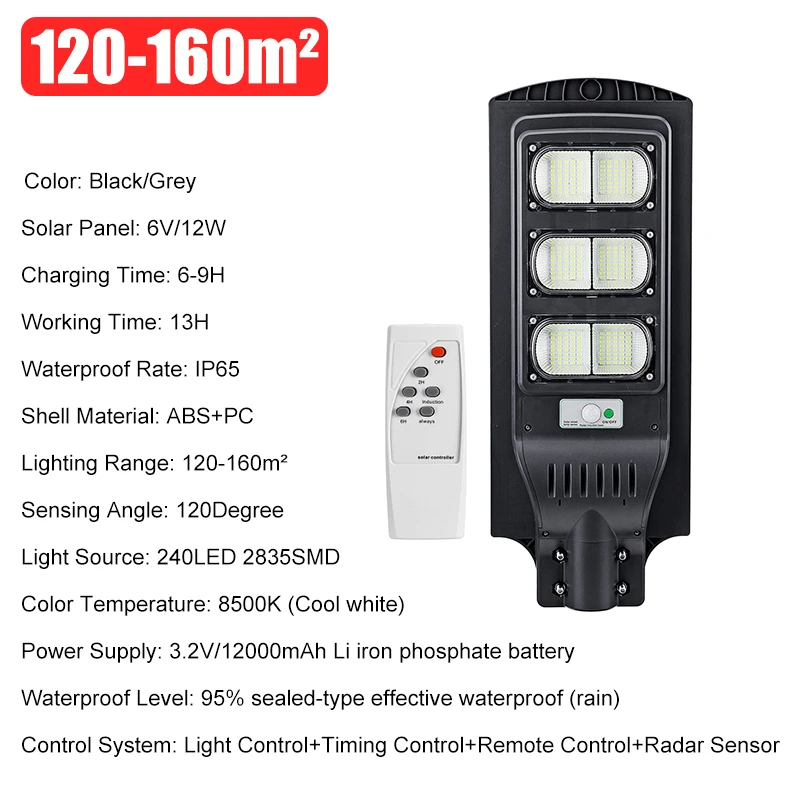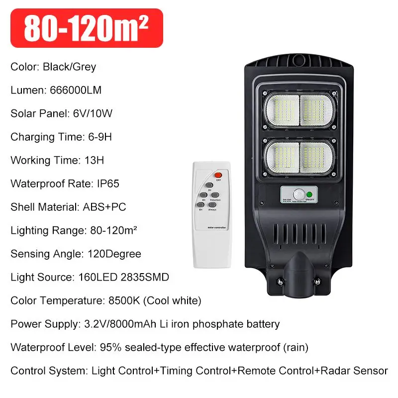 Особенности:-80/160/240/320 светодиодный s высокой яркости 2835 Светодиодный точечные лампы энергосбережения, даже светильник, продлевающие удовольствие.-Поликристаллическая солнечная панель преобразует солнечную энергию в электричество, более экологически чистый.-Технология распознавания человеческого тела делает его более энергоэффективным, светильник включается при обнаружении движения, тусклый светильник при отсутствии движения.-Солнечные панели преобразуют солнечную энергию в электричество, более экологически чистые.-Корпус из АБС-пластика, высокая твердость, герметичность и водонепроницаемость IP65.-Простая установка, без технического обслуживания надежная работа без необходимости подключения или траншеи. Водонепроницаемый алюминиевый сверхпрочный корпус.-Пожалуйста, включите переключатель перед установкой или зарядкой.-Применение: наружная стена или столб на площади, парке, саду, во дворе, улице, дорожке, пути, кампусе, ферме, периметре безопасности и т. Д.Характеристики:Светильник Цвет: белыйСтепень водонепроницаемости: IP65Цвет корпуса: серый/черныйМатериал корпуса: АБС-пластик + ПоликарбонатУгол срабатывания: 120 градусовЦветовая температура: 8500K (холодный белый)Источник питания: Встроенный литий-железо фосфатный аккумуляторУровень водонепроницаемости: 95% герметичный эффективный водонепроницаемый (дождь)Система управления: кнопочное управление + датчик движения + индукция Rada-r + пульт дистанционного управленияИсточник: светодиодный светильник высокой яркости 2835 (ярче, устойчив к температурам)80LED 200 ВтЦвет: черный/серыйЛюмен: 20000LMСолнечная панель: 6 В/8 ВтВремя зарядки: 6-9 чВремя работы: 13 чСтепень водонепроницаемости: IP65Материал корпуса: АБС-пластик + ПоликарбонатДиапазон освещения: 60-80 мУгол срабатывания: 120 градусовСветильник источник: 80LED 2835SMDЦветовая температура: 8500K (холодный белый)Источник питания: 3,2 В/6000 мАч литий-железо фосфатная батареяУровень водонепроницаемости: 95% герметичный эффективный водонепроницаемый (дождь)Система управления: светильник + таймер + пульт дистанционного управления + радар-датчик160LED 400 ВтЦвет: черный/серыйЛюмен: 40000LMСолнечная панель: 6 В/10 ВтВремя зарядки: 6-9 чВремя работы: 13 чСтепень водонепроницаемости: IP65Материал корпуса: АБС-пластик + ПоликарбонатДиапазон освещения: 80-120 мУгол срабатывания: 120 градусовСветильник источник: 160LED 2835SMDЦветовая температура: 8500K (холодный белый)Питание: 3,2 V/8000 мА/ч, литий-железо-фосфатный аккумуляторУровень водонепроницаемости: 95% герметичный эффективный водонепроницаемый (дождь)Система управления: светильник + таймер + пульт дистанционного управления + радар-датчик240LED800WЦвет: черный/серыйЛюмен: 80000LMСолнечная панель: 6 В/12 ВтВремя зарядки: 6-9 чВремя работы: 13 чСтепень водонепроницаемости: IP65Материал корпуса: АБС-пластик + ПоликарбонатДиапазон освещения: 120-160 мУгол срабатывания: 120 градусовСветильник источник: 240LED 2835SMDЦветовая температура: 8500K (холодный белый)Источник питания: 3,2 В/12000 мАч литий-железо фосфатная батареяУровень водонепроницаемости: 95% герметичный эффективный водонепроницаемый (дождь)Система управления: светильник + таймер + пульт дистанционного управления + радар-датчик320LED 1200 ВтЦвет: черный/серыйЛюмен: 32000 лмСолнечная панель: 6 В/15 ВтВремя зарядки: 6-9 чВремя работы: 13 чСтепень водонепроницаемости: IP65Материал корпуса: АБС-пластик + Полика