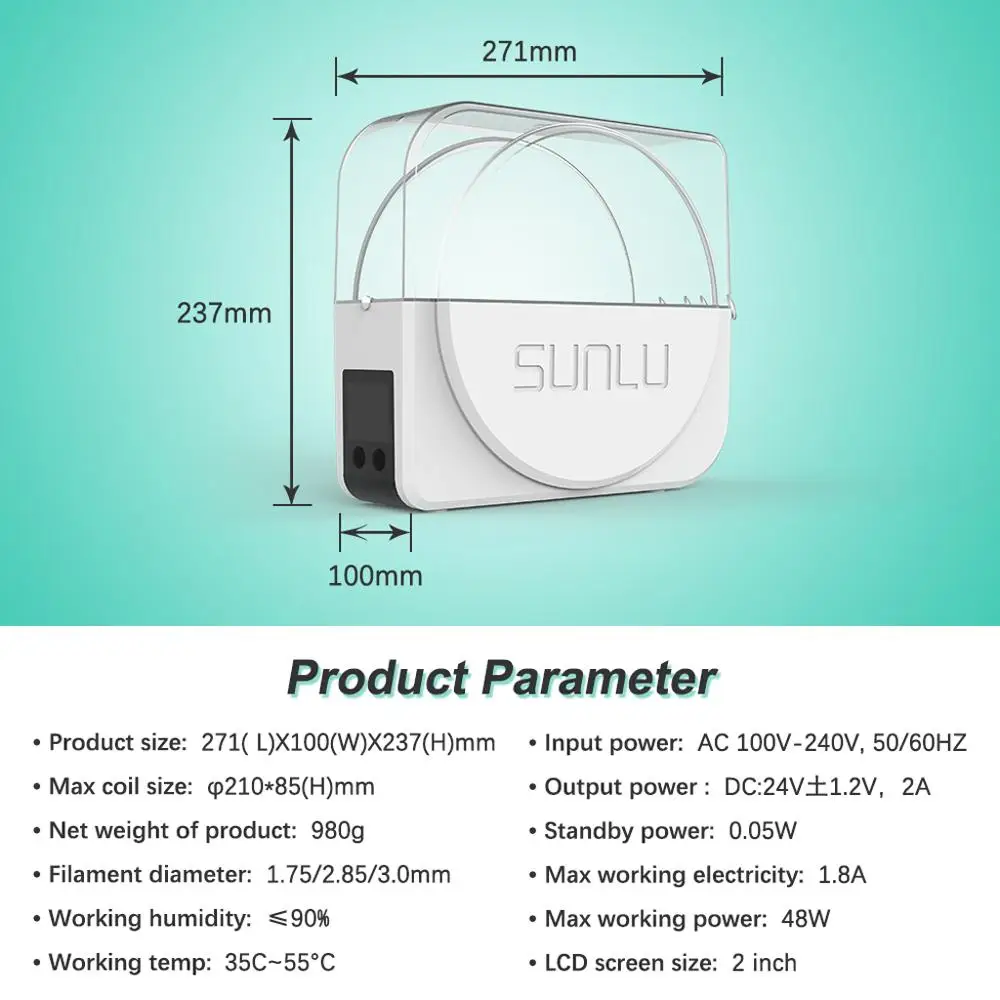 1. Размер продукта: 271 (Д) x 100 (Ш) x 237 (В) мм.2. Максимальная емкость: Φ210 (диаметр) x 85 (В) мм.3. Вес нетто: 980 г (включая адаптер питания).4. Рабочая среда:A) температура окружающей среды: 20 ℃ ~ 35 ℃.B) Относительная влажность: ≤ 90%.5. Диапазон настройки температуры: 35 ℃ ~ 55 ℃.6. Характеристики адаптера питания:A) Вход Технические характеристики: AC 100V ~ 240 В пер. тока, 50 / 60 Гц.B) Выход Технические характеристики: постоянный ток: 24V ± 1,2 V, 2A.7. Потребляемая мощность в режиме ожидания: 0,05 Вт.8. Максимальный рабочий ток: 1.8A.9. Максимальная Рабочая мощность: 48 Вт.10. Подходит для нить диаметров: 1,75 мм/2,85 мм/3,00 мм.
