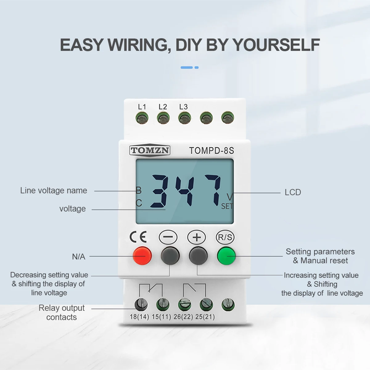 3-фазное защитное реле для контроля напряжения на Din-рейке, регулируемое Защита от перенапряжения