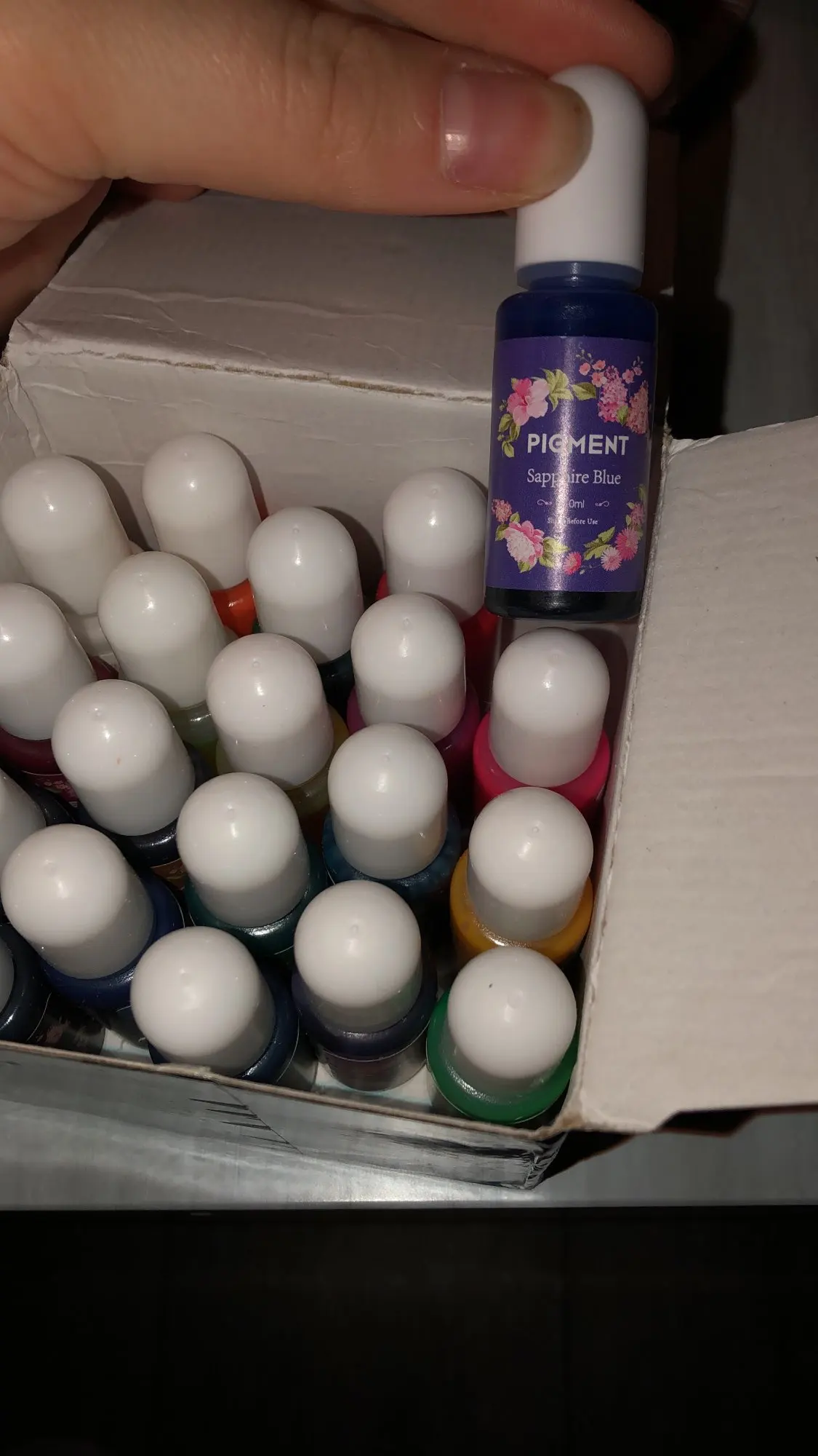Я думал, что это пластиковая коробка, ошибка с моей стороны, она сделана из картона, но я все еще счастлив, что нашел другую прозрачную коробку, чтобы положить мои бутылки и чтобы иметь возможность увидеть эти красивые цвета.