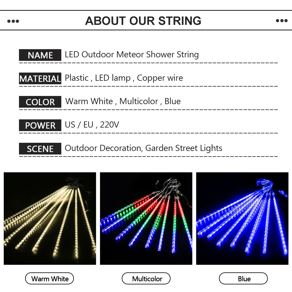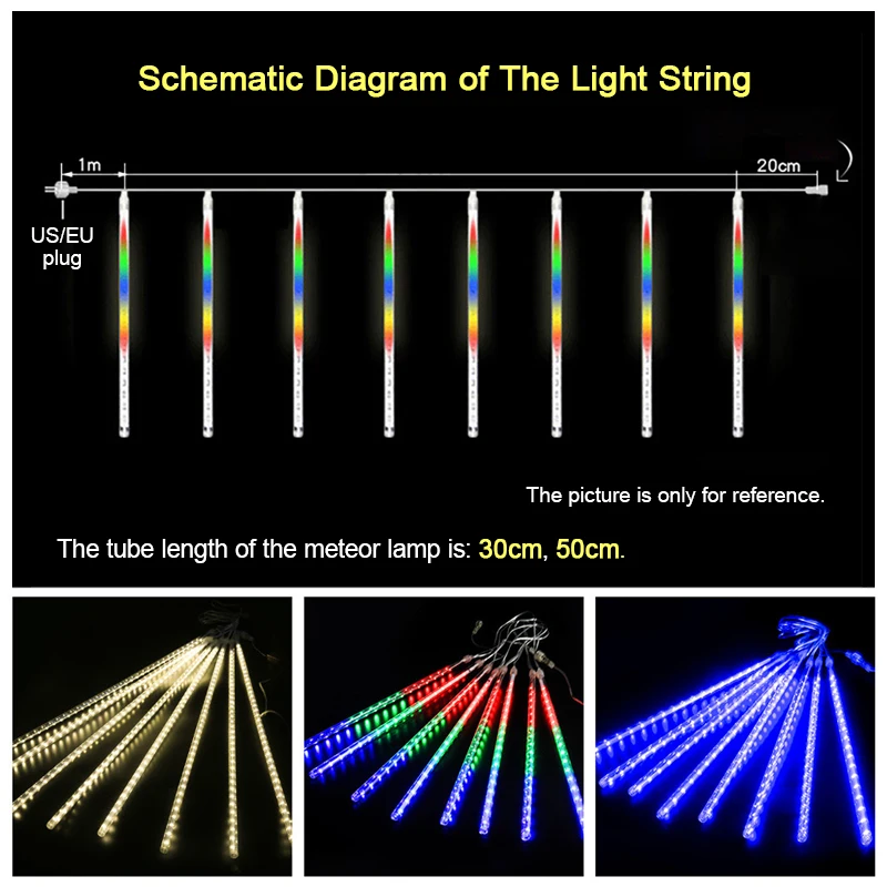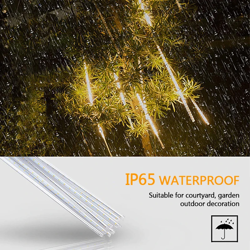 Использование высокоярких SMD2835 двухсторонних ламп для достижения эффекта метеоров. Интерфейс Waterproff, безопасный и простой в использовании. Водонепроницаемая вилка стандарта США/ЕС, более безопасная и долговечная.