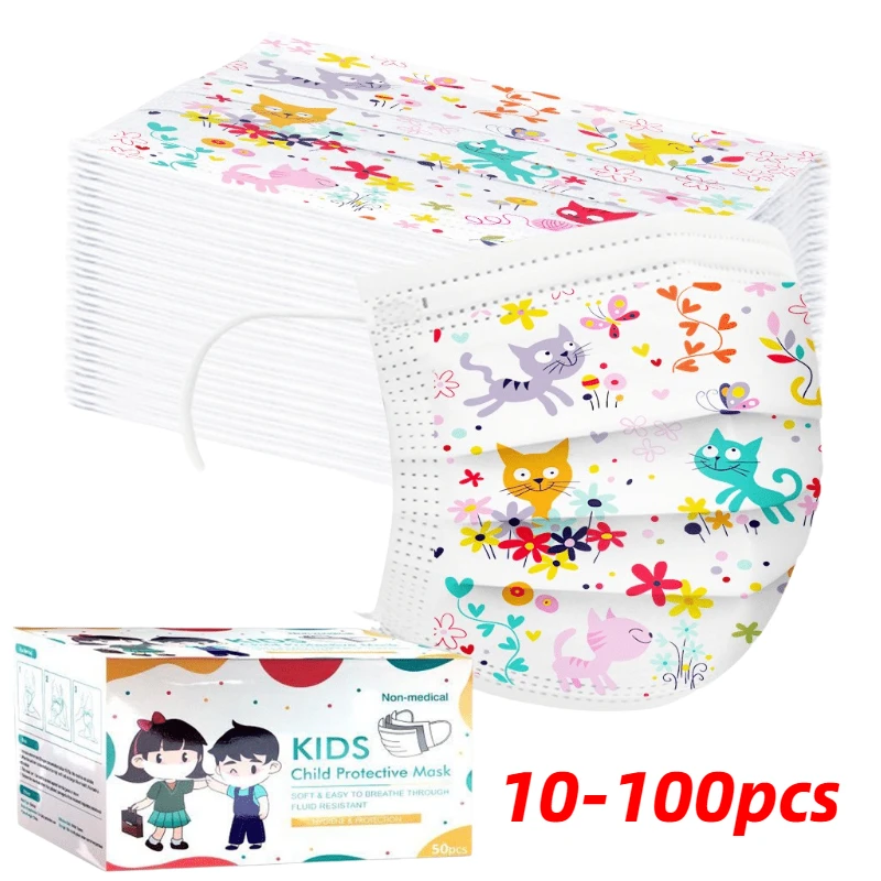 Маски детские одноразовые пылезащитные эластичные с принтом кошки, 10-100 шт.