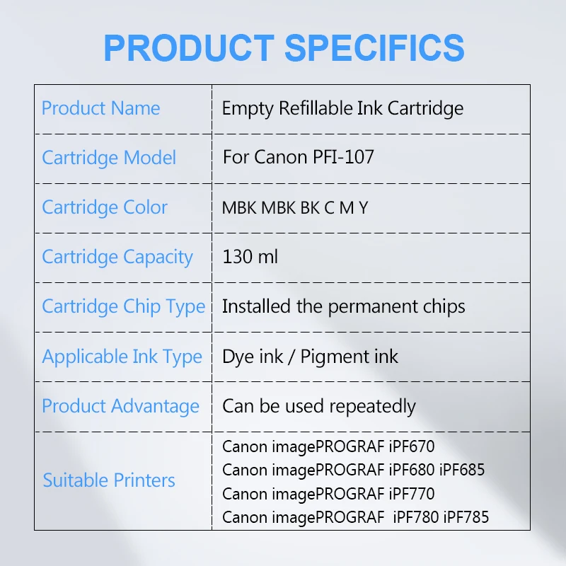 Многоразовый картридж PFI-107 PFI107 с постоянными чипами для Canon iPF670 iPF680 iPF685 iPF770 iPF780 iPF785 130 мл, 6 цветов