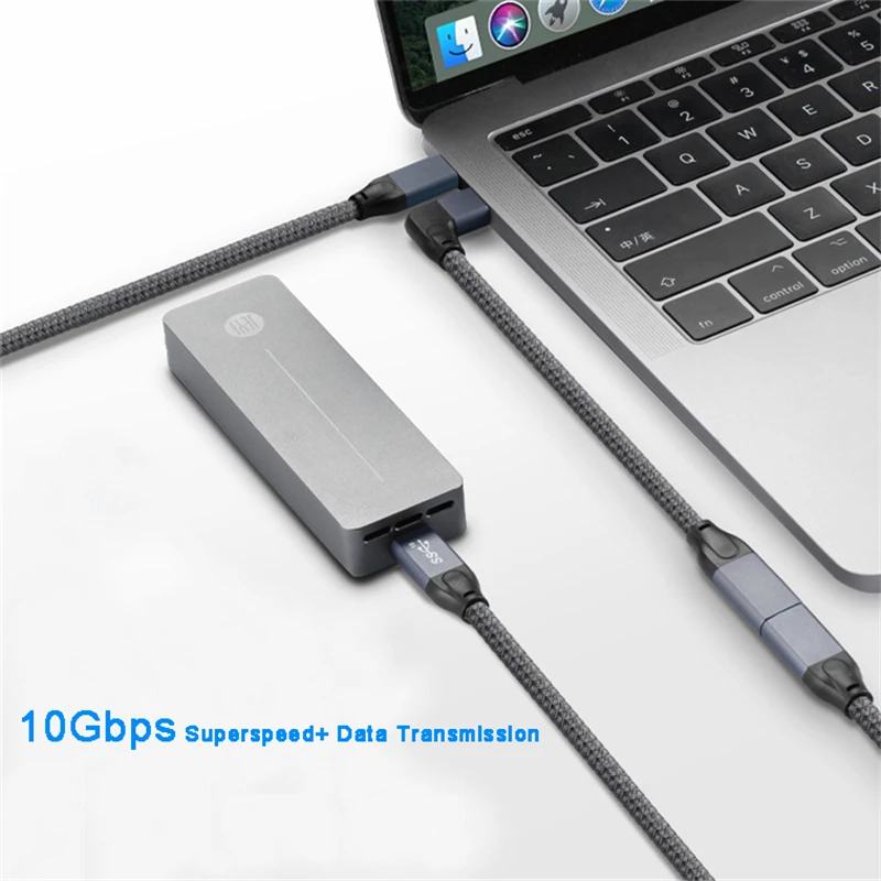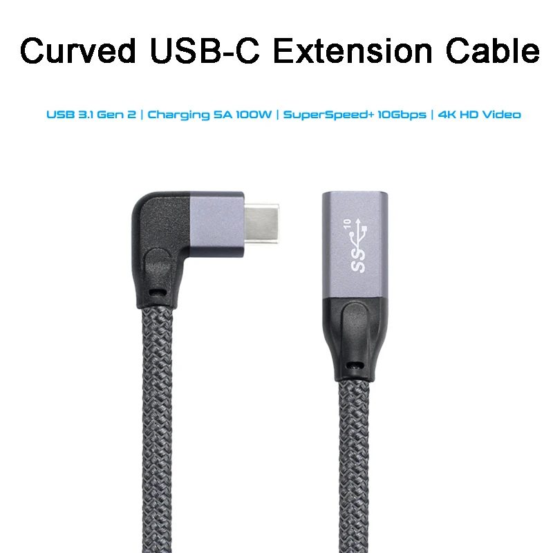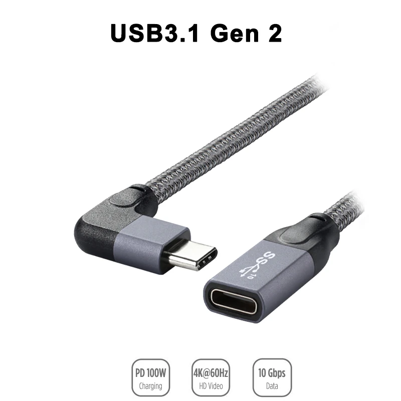 Кабель-удлинитель USB3.1 Gen 2USB-C, 1м, поддержка быстрой зарядки 100Вт 5A, угловой разъем (штекера), 4K60Гц, скорость передачи данных 10 Гбитс, для MacBook, Nintendo, ноутбуков Asus, HP