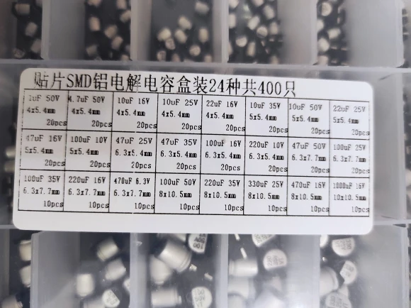 Набор алюминиевых электролитических конденсаторов, 24 значения, 400 шт., 1 мкФ Ф 1000 мкФ, 6,3-50 в, SMD, в ассортименте, с коробкой