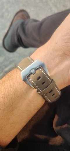 ремешок рекомендую. в комплекте имеется небольшой инструмент для удобной замены ремешка. место где стоит втулка немного утолщена и не сразу защелкивалась, пришлось чучуть повозиться, но только с одной стороны. тем неменее не слитает и не отстегивается. выглядит отлично. с наружи под замшу, внутри гладкая кожа что несомненно плюс, пот от руки будет меньше и медленнее впитывать и дольше не завоняет.