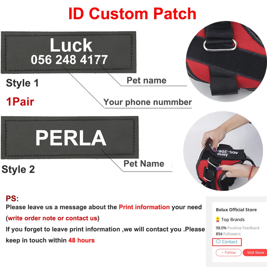 ID на заказ собачий поводок ----------------- предотвращает потерю собак. Дайте им шанс вернуться домой один разОписание:❤Супер удобно: Тянущее давление равномерно распределяется по телу, чтобы предотвратить вытягивание и удушье. Поводок для собаки имеет регулируемый нагрудный ремень с защелкой на пряжке, свободно перемещает его части тела, может быть адаптирован для роста ваших собак, не нужно всегда менять его.❤Прочная ручка: прочная нейлоновая ручка еще больше увеличивает расстояние от собаки и более близка друг к другу. Это также Лучший партнер для обслуживания собак и легко контролировать вашу собаку.❤Безопасность на открытом воздухе: Светоотражающие ремни обеспечивают высокую видимость вашей собаки и безопасность собак в ночное время. Вы можете подключить собачий поводок на d-образном кольце, и это безопаснее на многолюдных улицах. Высококлассный жгут идеально подходит для ежедневной ходьбы, бега, походов, тренировок, охоты, приключений на открытом воздухе и многого другого!❤100% гарантия соответствия: мы стремимся предоставлять нашим клиентам высококачественную продукцию и лучший опыт покупок. Если вы столкнулись с какими-либо проблемами или не удовлетворены каким-либо образом, просто отправьте нам письмо, и мы предоставим лучшее решение, и все проблемы будут решены в течение 24 часов.★Как сделать заказПримечание:☆Пожалуйста, оставьте нам сообщение о необходимой Вам информации! Мы можем напечатать ваш язык на липучке (например: английский или русский и т. Д.) имя питомца + номер телефона, такой как: Luck 432 456 7897 1 пара☆Если вы забыли сообщение. Мы постараемся связаться с вами. Пожалуйста, свяжитесь с нами в течение 24 часов после размещения заказа.☆Если мы не сможем получить ваш ответ. Мы отправим вам случайную липучку --Например (собака для обслуживания, на тренировках, не для домашних животных)