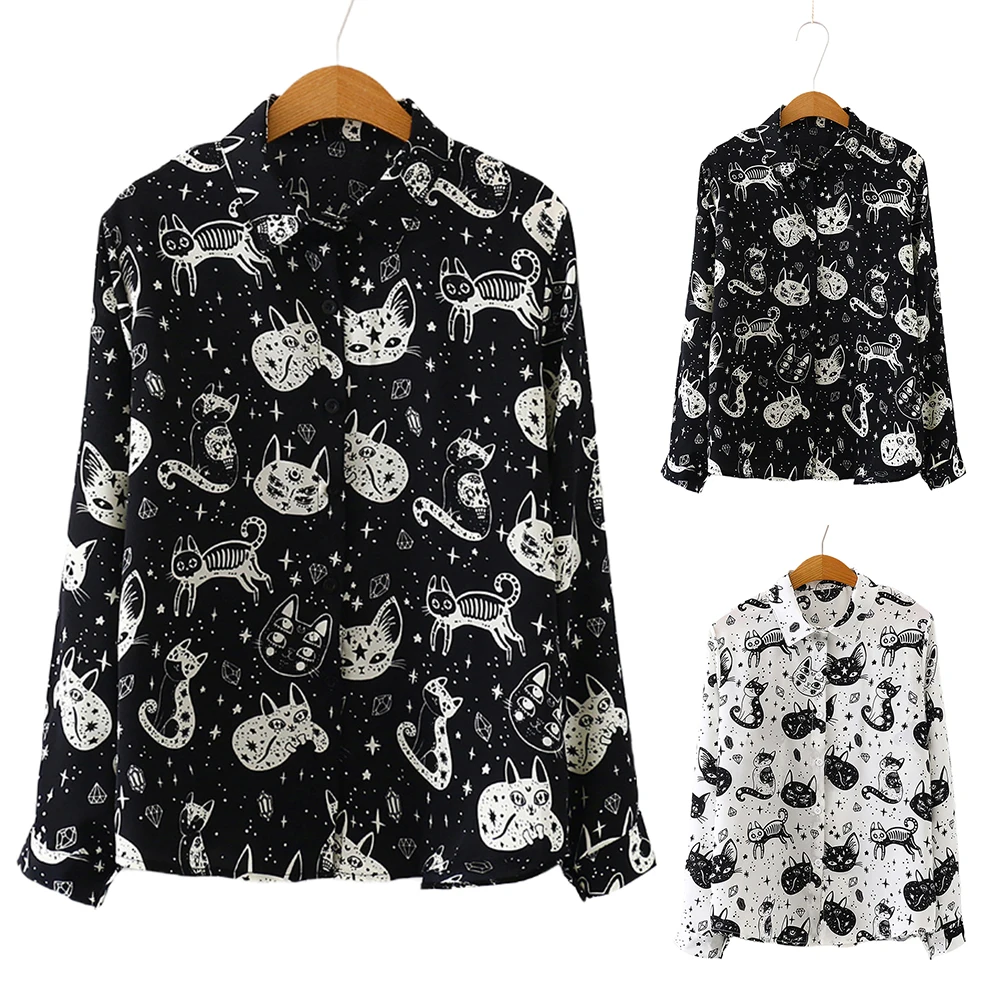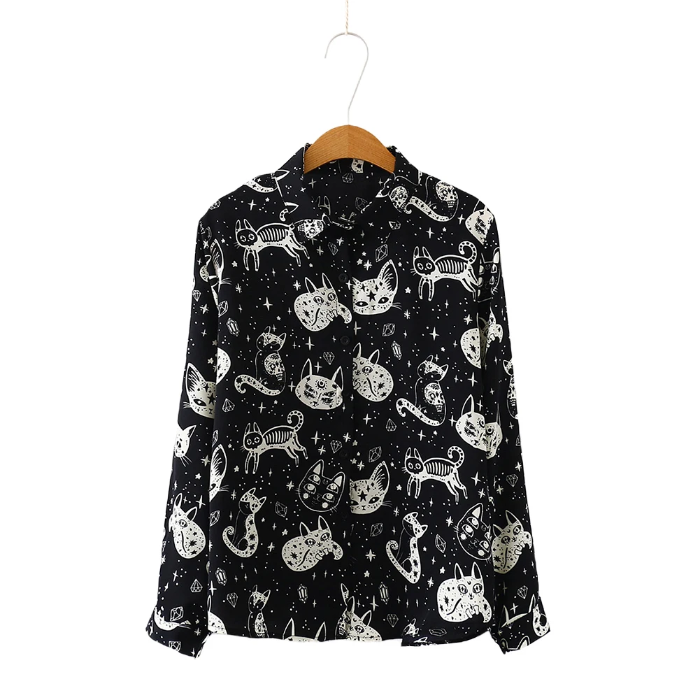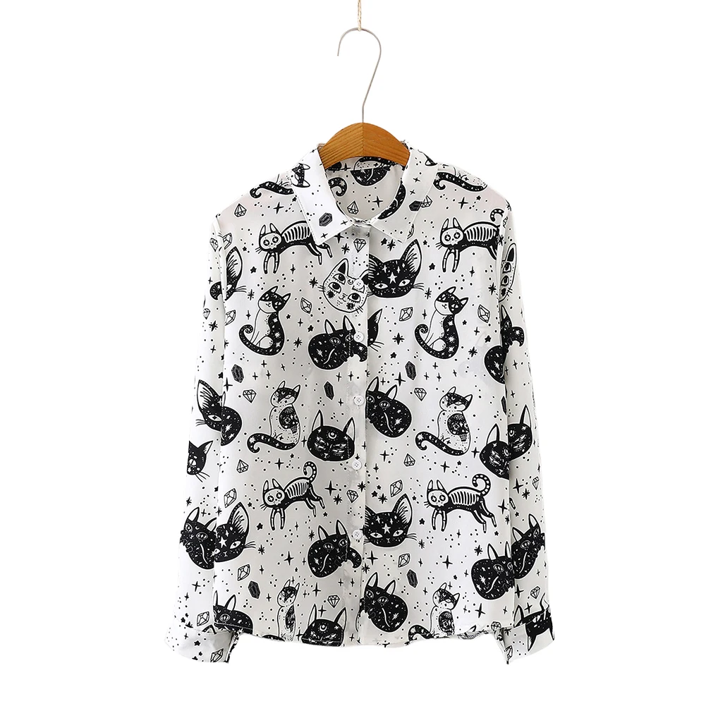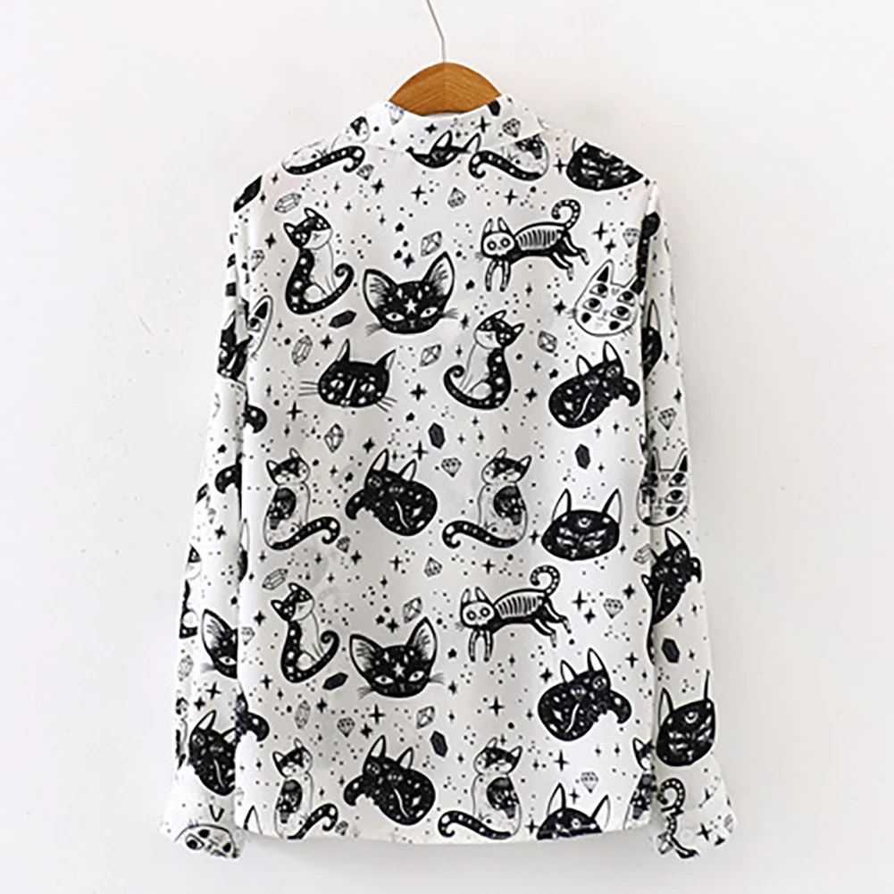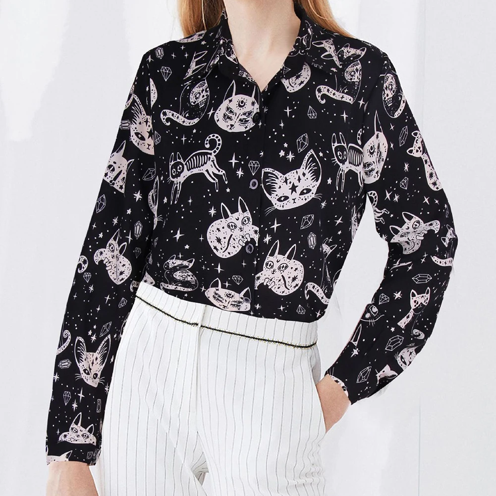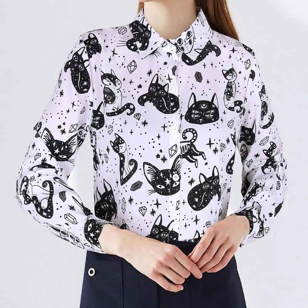 Женская офисная блузка, с принтом в виде кошек, с длинным рукавом и отложным воротником