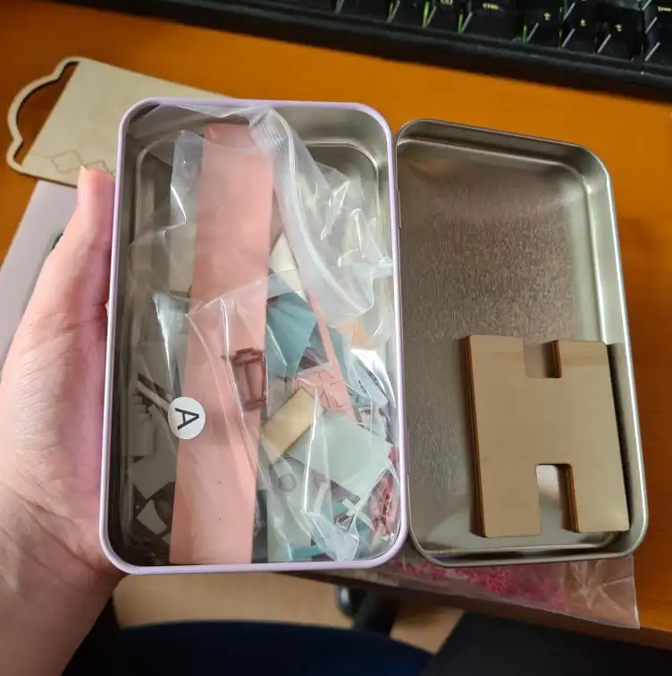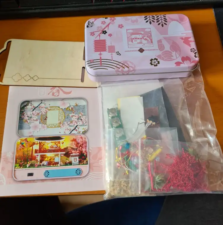 Я заказал два разных набора и удивился, что оба упакованы в одну коробку. К сожалению, все было упаковано очень аккуратно, поэтому ничего не было сломано или согнуто (все маленькие деревянные детали были скрыты внутри олова). Включены фотографии розового/весеннего комплекта.